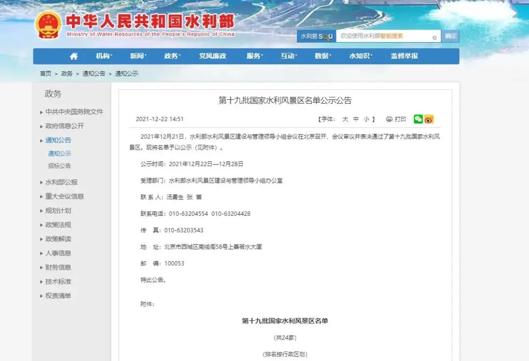 第十九批国家水利风景区名单公示公告