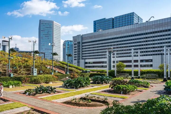 JR大阪站直結的大阪站City(Osaka Station City)。這裡除了有許多購物地點外,也有適合休憩或會合的廣場,以及被稱作「都市綠洲」的庭園散布其中。其中之一就是位於North Gate Building 14樓的「天空農園」。園內採用了日本與大阪森林中常見的植物,佈置成庭園與菜圃,是能享受綠意的療癒空間。