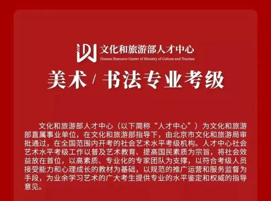 文化和旅游部人才中心(以下简称“人才中心”)为文化和旅游部直属事业单位,在文化和旅游部指导下,由北京市文化和旅游局审批通过,在全国范围内开考的社会艺术水平考级机构。