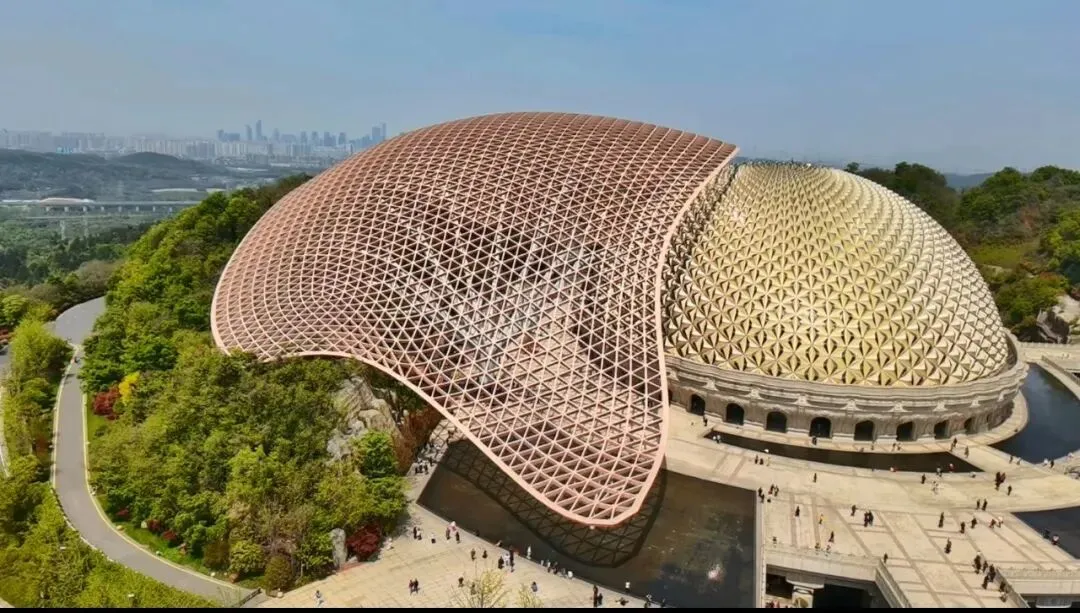 佛顶宫的外观,整体建筑分为大穹顶和小穹顶两个部分,每一处造型都饱含深厚寓意。造型飘逸的大穹顶,以自然的弧度曲线贴合残留的西峰走势,将西峰缺失的山体轮廓修补完整,它形如一件佛祖袈裟,覆盖在小穹顶之上,寓意袈裟护持舍利圣物。从远处眺望,大穹顶与右侧的东峰相映成趣,完美恢复了牛首山双峰对峙的格局,实现了“补天阙、藏地宫、修圣道、现双塔”的创意理念。