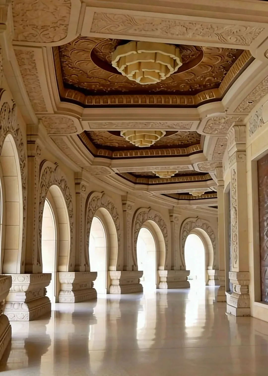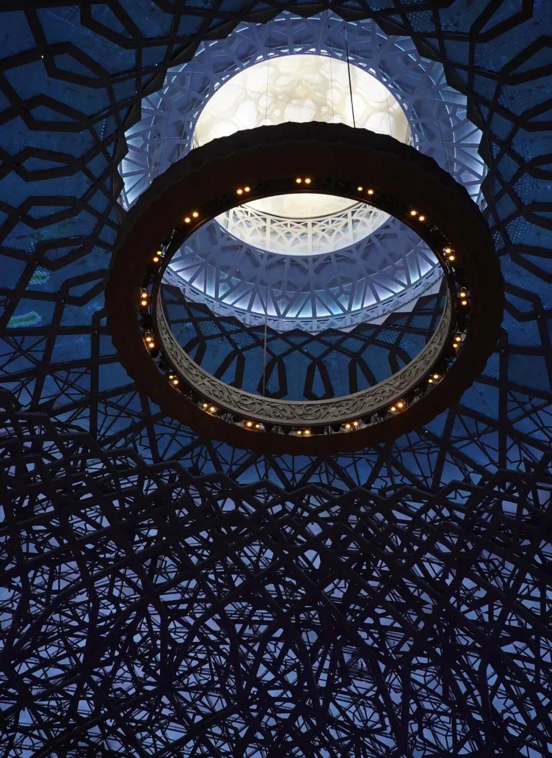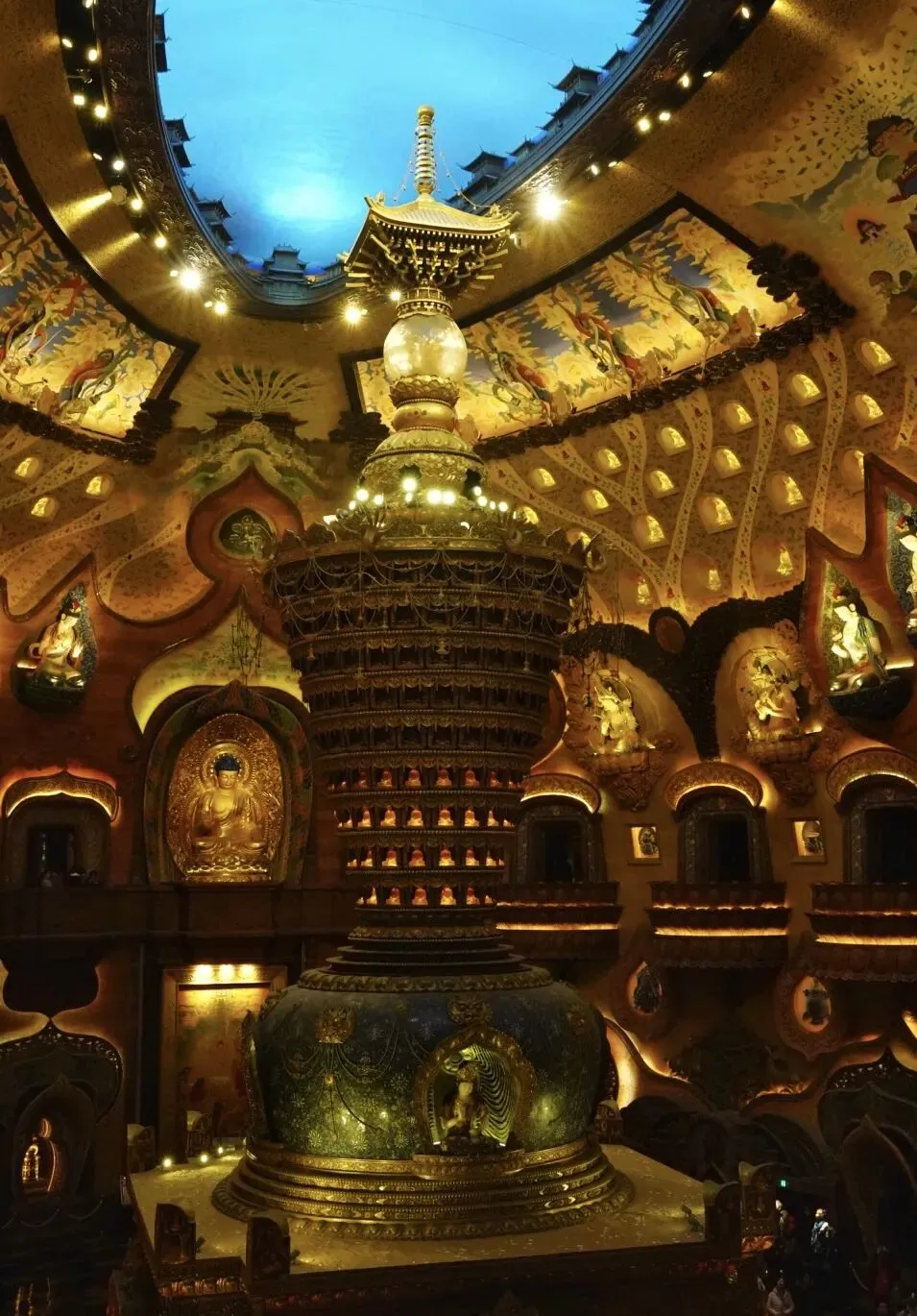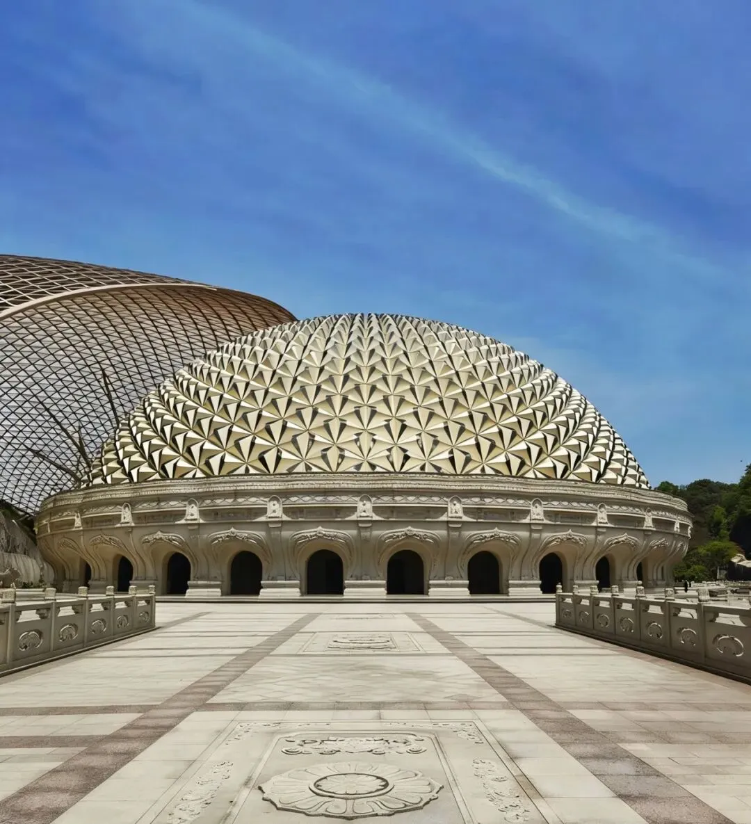 小穹顶的设计更是精妙绝伦,上方的三角体造型意蕴丰富,既像一双双中空合十的佛手,象征千万信众对佛祖的虔诚供养;又与佛祖的发髻极为相像,暗喻佛顶宫供奉着释迦牟尼佛顶骨舍利。小穹顶下方由56座飞天菩提门组成莲花宝座,上方形如一颗巨大的摩尼宝珠,上下辉映,共同构成了“莲花托珍宝”的神圣意象,一眼望去,便尽显佛国的庄严与神圣。