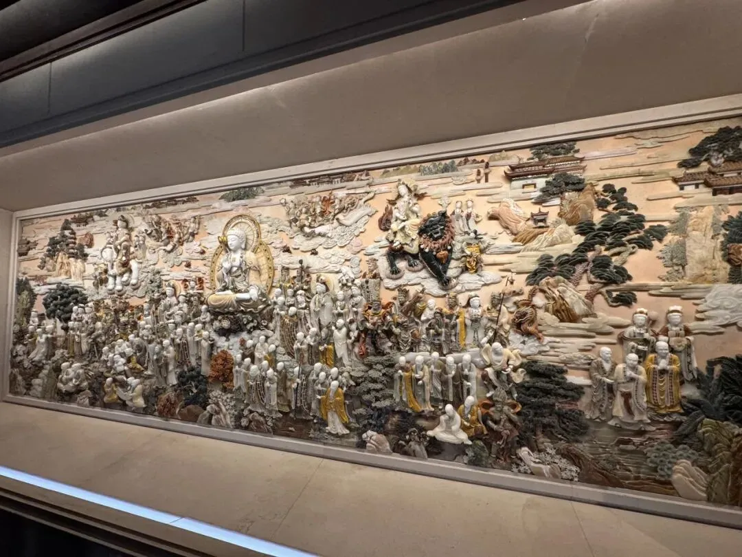 这幅玉石彩雕壁画精选寿山石、青田石、汉白玉、琥珀玉等二十余种天然玉石精心雕刻而成,工艺精湛、材质珍奇。画面以身高比例的差异巧妙区分修行者的不同果位,生动刻画了近百位神态各异、造型独特的人物形象,整体场景气韵生动、形神兼备。壁画所呈现的经变图,讲述的正是禅宗最为著名的公案——拈花一笑,这一典故也是禅宗思想的核心起源。