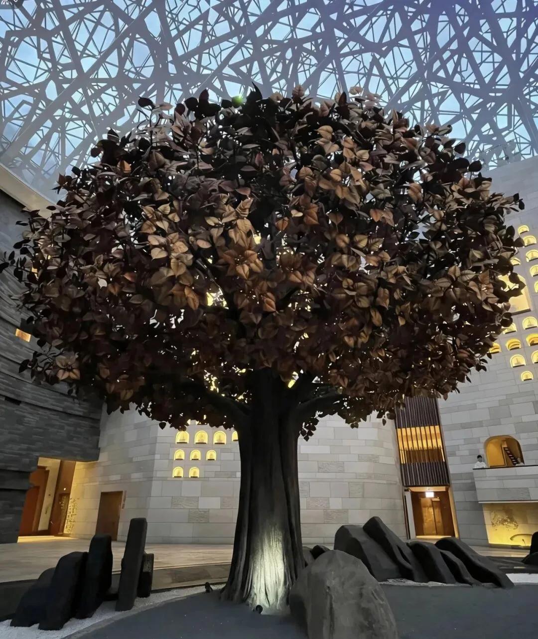 空间的南侧,伫立着一棵无忧树,纪念佛陀诞生之处;北侧则是菩提树,象征着佛陀在此觉悟成佛。头顶之上,枝枝杈叉的艺术装置模拟了娑罗树的形态。那是佛陀最终涅槃的地方。这三棵树与中间的卧佛相连,刚好串起了佛陀从出生、成道到涅槃的完整一生轨迹。