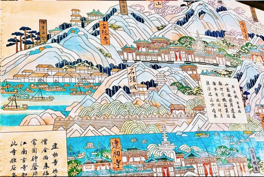 丝毯画的创作灵感,源自唐代诗人杜牧《江南春》中“千里莺啼绿映红,水村山郭酒旗风。南朝四百八十寺,多少楼台烟雨中”的千古名句。南京素有“江南佛国”的美誉,南北朝时期佛教鼎盛,因梁武帝笃信佛教,城内寺庙林立,民间更有“出了南门尽是寺”的说法。这幅丝毯画,正是再现了南京南朝时期梵宇林立的盛景。