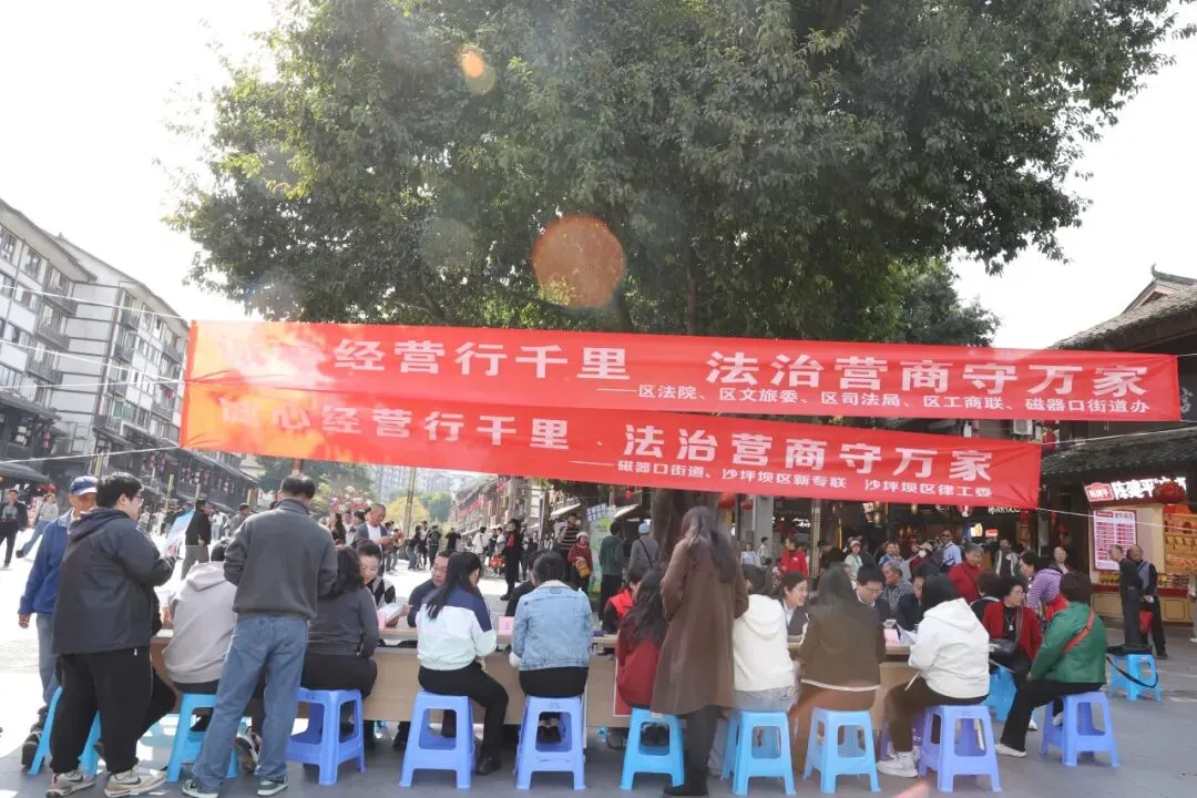磁器口古镇日均客流数万,商户上千,消费场景多元密集,是展现城市法治环境的重要窗口。如何让法治精神真正扎根这片商业沃土?区司法局相关负责人表示,只有多部门联动协同、各展所长,用群众听得懂、看得见、记得住的方式开展普法宣传,才能把法律知识真正送到消费者和经营者身边,既能引导游客群众理性维权、依法维权,也能进一步推动经营者诚信守法。