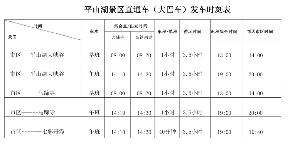直通车针对平山湖大峡谷、马蹄寺、七彩丹霞三大热门景区,设置固定往返班次,车程、游玩时长规划合理,预留充足游览时间,告别匆忙打卡,沉浸式感受张掖风光,具体班次信息如下: