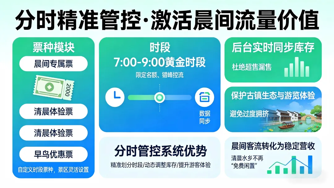 系统支持自定义时段票种,景区可灵活设置晨间专属票、清晨体验票、早鸟优惠票,精准划分 7:00-9:00 黄金时段,限定名额、错峰控流。后台实时同步库存,杜绝超售漏售,既保护古镇生态与游览体验,又能将晨间客流转化为稳定营收,让清晨的水乡不再 “免费闲置”。