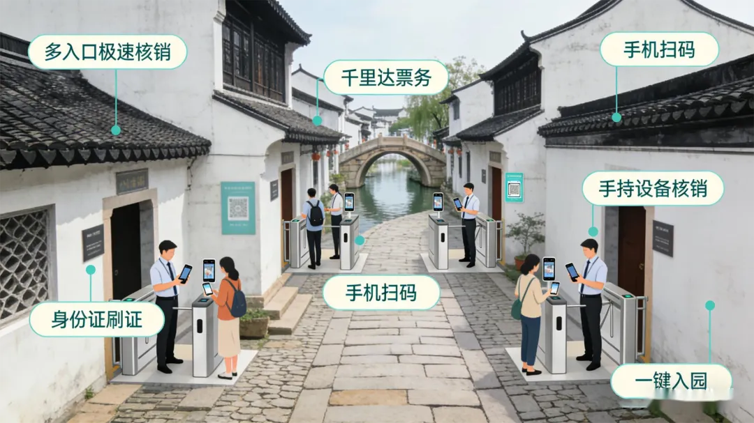 江南古镇出入口分散、闸机安装受限,千里达票务支持手机扫码、身份证刷证、手持设备核销三合一,无需固定设备,工作人员随身携带即可完成核验。游客无需排队换票,一键入园,完美适配古镇小桥流水、多巷通行的地形特点,提升入园效率与游客好感度。