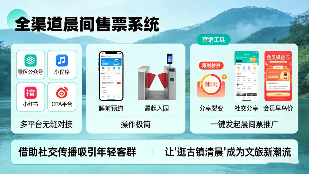 系统无缝对接景区公众号、小程序、抖音、小红书及各大 OTA 平台,游客睡前预约、晨起入园,操作极简。同时支持限时秒杀、分享裂变、会员早鸟价等营销工具,景区可一键发起晨间票推广活动,借助社交传播吸引年轻客群,让 “逛古镇清晨” 成为文旅新潮流。