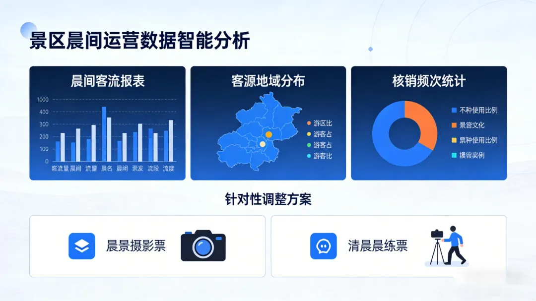 后台自动生成晨间客流报表、客源地域、核销频次等数据,景区可清晰掌握晨间游客偏好,针对性调整票种策略、配套服务。比如针对摄影游客推出 “晨景摄影票”,针对本地居民推出 “清晨晨练票”,精准满足不同人群需求,让运营更有方向、更具效率。