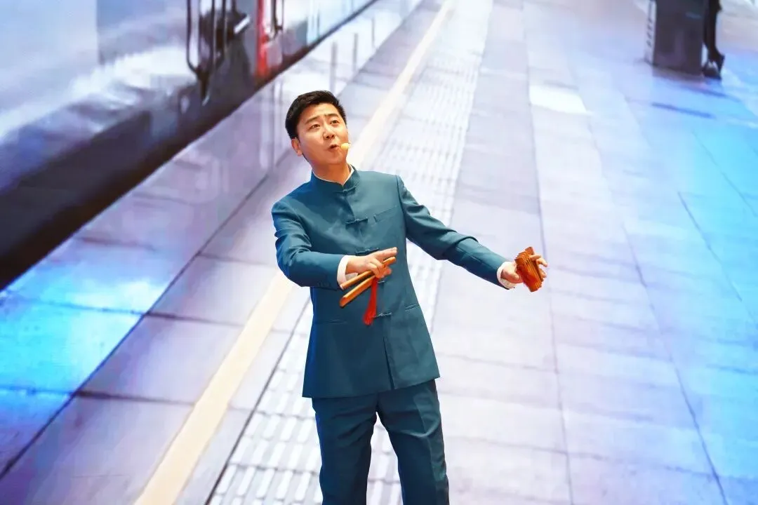 山东省文化馆的快板《好客山东文物行》将齐鲁大地的文脉底蕴与列车的核心特色巧妙融合,从亚醜钺的商代峥嵘,到错金银牺尊的战国匠心;从新石器玉锛的岁月痕迹,到宜子孙玉璧的温润传承……全方位呈现列车青铜、玉器、陶瓷等七大主题车厢的特色布局,直观展现“移动博物馆”的独特魅力,让现场嘉宾沉浸式感受列车将文物元素与出行体验深度融合的创新理念。