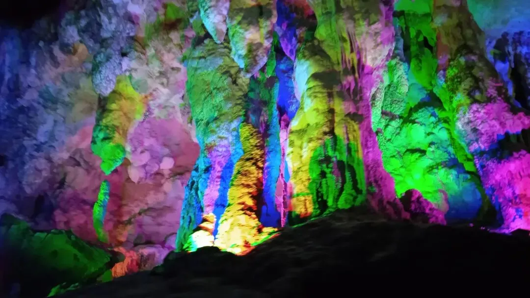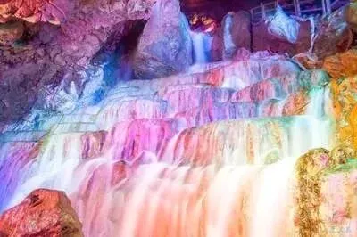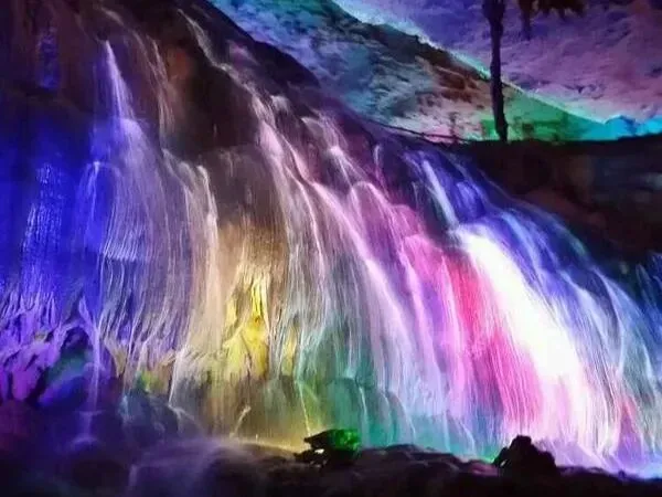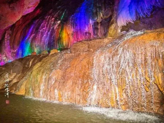 弃船上岸,又见“飞龙瀑布”。30米高的石幔从洞顶倾泻,虽无水声,气势如虹。灯光流转,如银河倒挂。