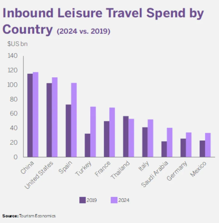 在2018年之前的20多年里,美国始终保持着全球入境休闲旅游消费榜首的位置,在2019年被中国超越。不过,如果从入境休闲游客的人次看,美国、西班牙、法国将排在中国前面。从入境休闲旅游需求的增长速度看,土耳其预计会是2024年全球增长第一名的国家,将比2019年上涨13%。与2019年相比,2024年全球入境休闲旅游增长最快的国家预计还有:西班牙(10%)、法国(7%)、沙特阿拉伯(7%)。