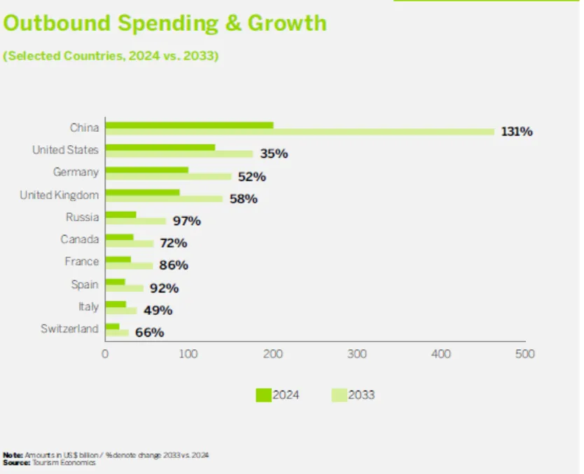 图4:2024年与2033年全球前10位出境旅游国家的消费预测对比(货币:美元,单位:十亿)