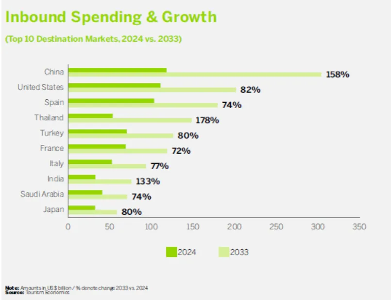 美国将继续保持全球第二大入境旅游目的地的地位。泰国预计到2033年将超越法国和土耳其,变成世界第四大入境旅游接待国。日本的入境旅游将受益于以中国游客为主的亚太地区,从而也获得持续性增长。沙特阿拉伯国际旅游业的飞升则是由于他们对旅游业进行的持续大力投资。