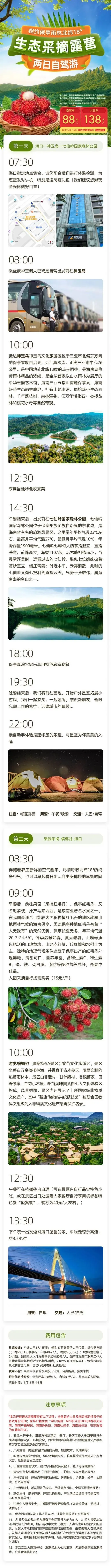 周末保亭自驾游约起!攻略+行程安排出炉!景区传承千年的中华玉文化为核心,将玉文化、生态雨林风情与民族文化相融,让你在山水的滋润涤荡中修禅养性。 前往七仙岭景区,这里有着得天独厚的旅游资源,其范围内的空气质量优越,富含负氧离子,被誉为“天然大氧吧”,加上天然的地热温泉,使得景区有着不可媲美的优势,成为国内外游客纷至沓来的旅游胜地。 赶赴槟榔谷,独具特色的热带雨林奇观让你身心震撼,长达数公里雄伟瑰丽的峡谷风貌让你目不暇接,一起感受原生态的自然人文景观,探寻原汁原味的少数民族文化。 夜色下,聆听一曲黎歌,可以看一场盛大的篝火走进一片雨林,可以收集最纯净的氧气,这里,能满足你对田园生活的所有向往。 又到了红毛丹成熟上市的季节,红彤彤的果实挂满枝头,分外诱人。本次活动将前往果园进行采摘活动,与绿色大自然来一场亲密接触,让你回忆童年中最感动的瞬间。 经过50多年耕耘,红毛丹以绿色无公害、形色俱佳,清甜甘美等特点深受市场青睐并成为保亭的特色水果,其果肉口味清甜多汁,肉厚甘香,富含碳水化合物、各种维生素和矿质元素。