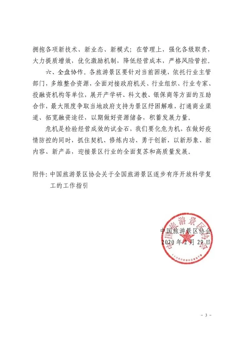 2月29日,中国旅游景区协会发布《关于疫情防控期间景区要严格管控 有序开发 因地制宜 科学复工的建议》(旅景协发{2020}6号),提出各旅游景区要按照外防输入、内防扩散的要求,对景区开放条件和必要性进行全面评估,经当地疫情防控工作领导小组或政府有关部门批准后有序有控开放。景区有序有控开放遵循“大空间、发放式街区、自然类景区优先”,“室内场馆和以室内参观为主的旅游景区暂不开放”的原则,各地因自身条件而定,不“跟风”,不搞“一刀切”。