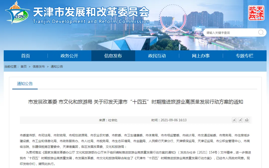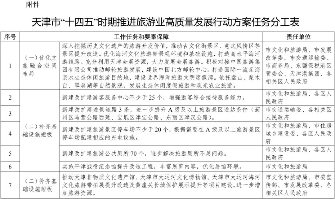 为进一步推进天津“十四五”时期旅游业高质量发展,市发展改革委、市文化和旅游局联合制定《天津市“十四五”时期推进旅游业高质量发展行动方案》。方案提出,将构建“一核一带两园三区六组团”的文旅融合发展空间布局,提升全市文化旅游整体水平。