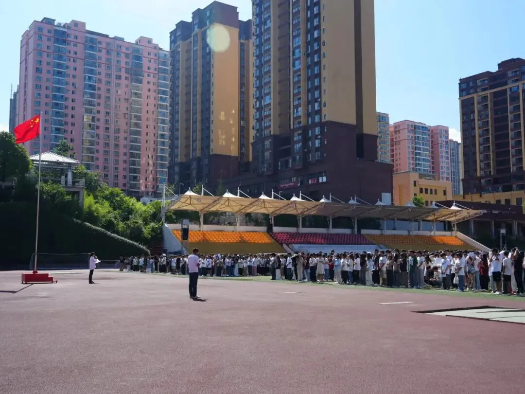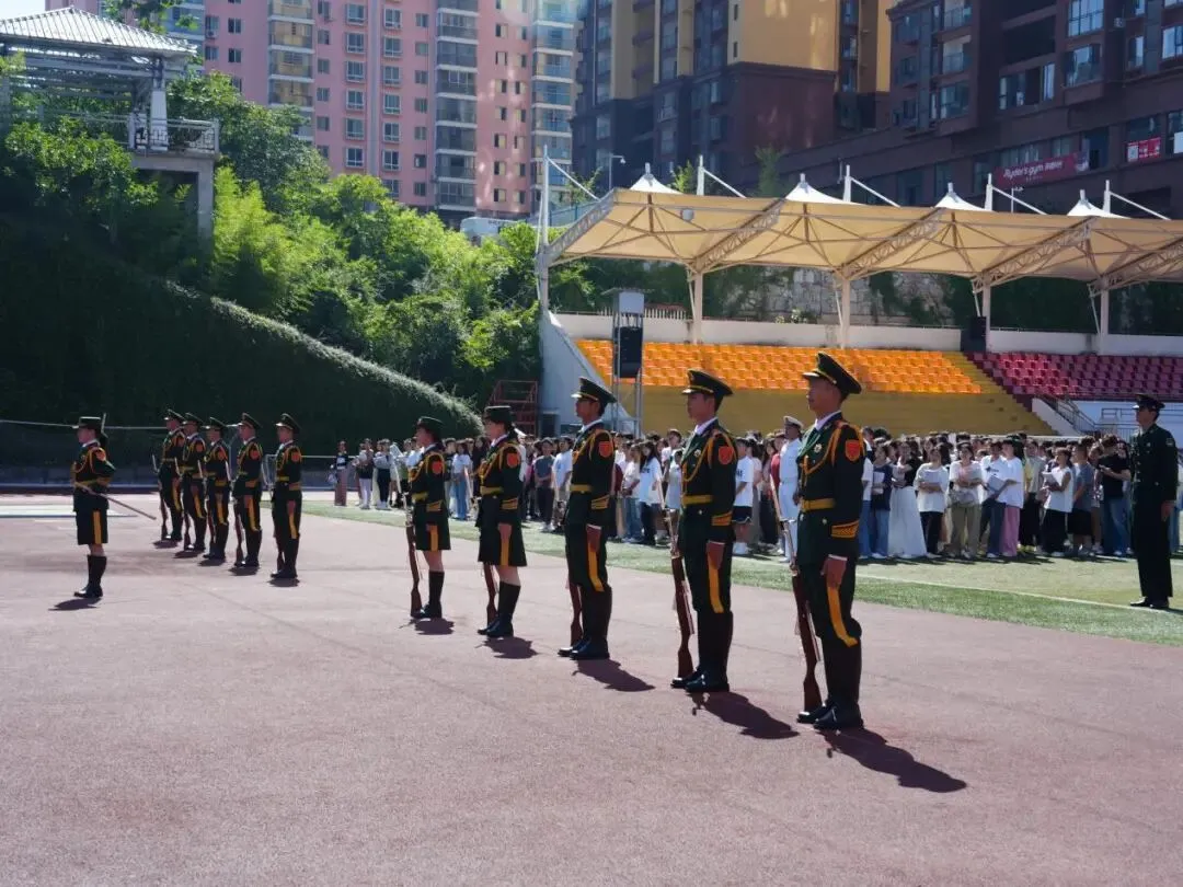 升旗仪式现场 上午10时,升国旗仪式正式开始。伴随着嘹亮的口号,国旗护卫队迈着整齐的步伐,身姿笔挺、精神昂扬地护送着国旗走向升旗台。在雄壮的国歌声中,五星红旗冉冉升起,迎风飘扬。在场全体师生一起高唱国歌,并向国旗行注目礼,场面庄严肃穆。