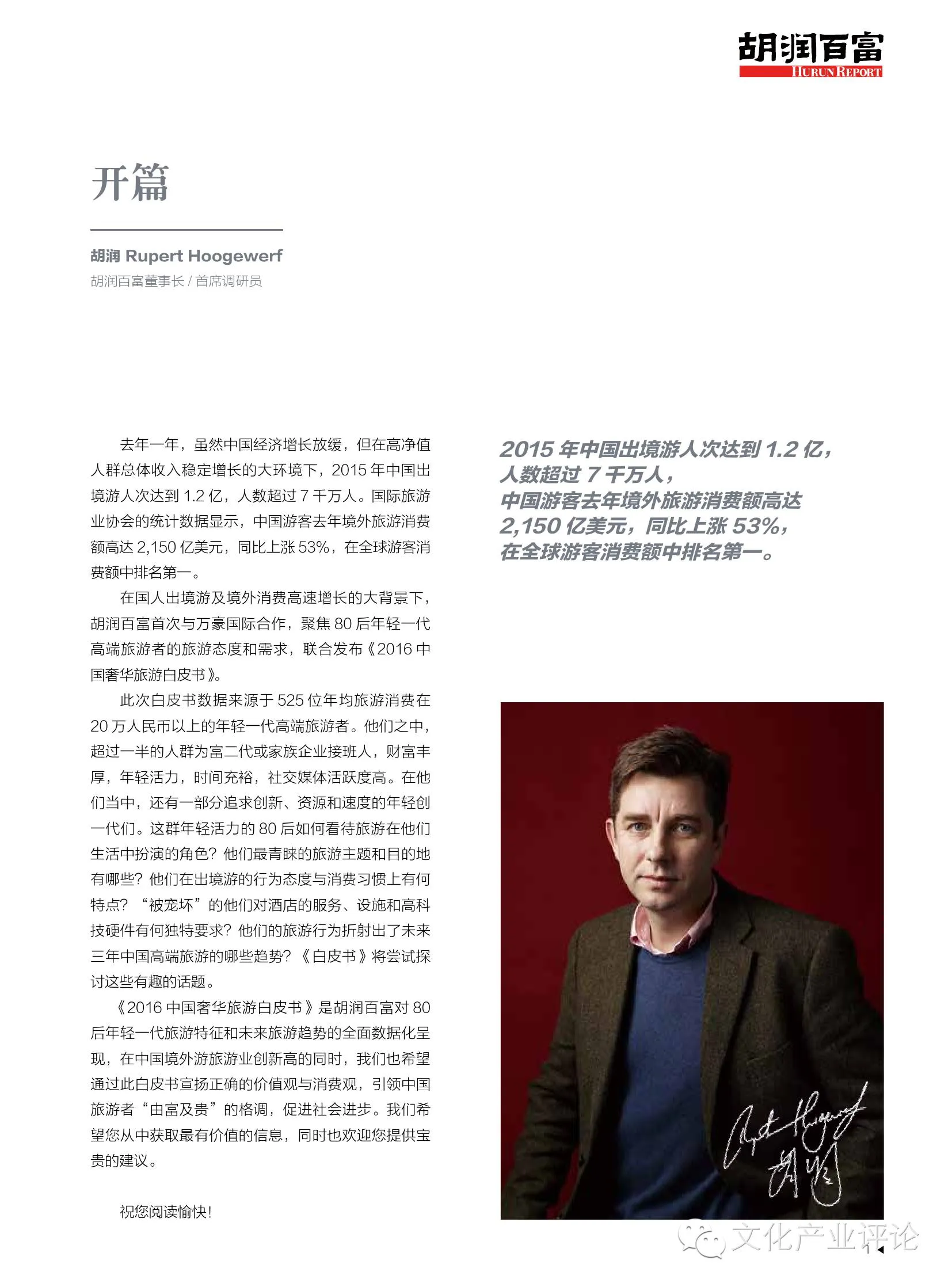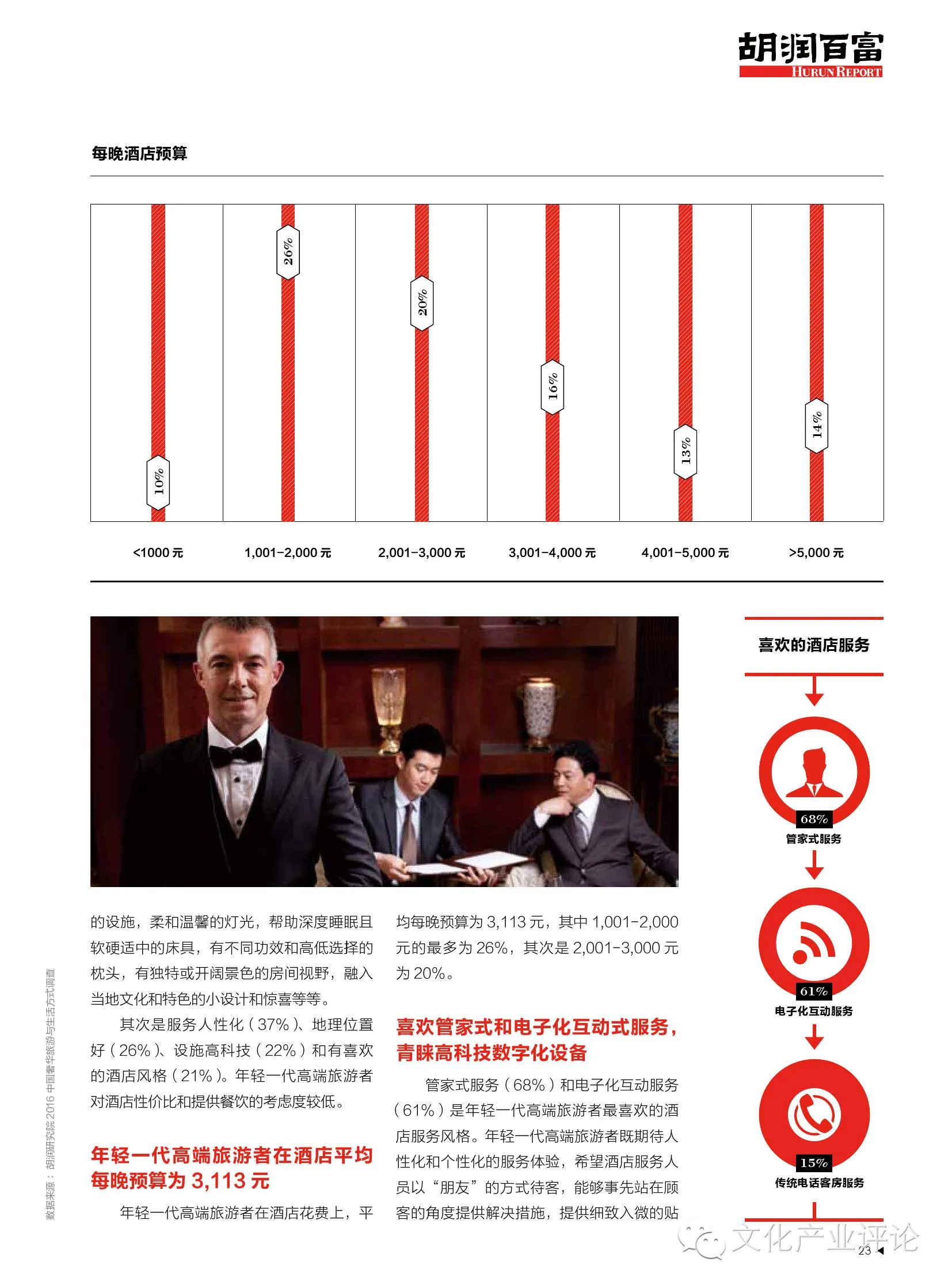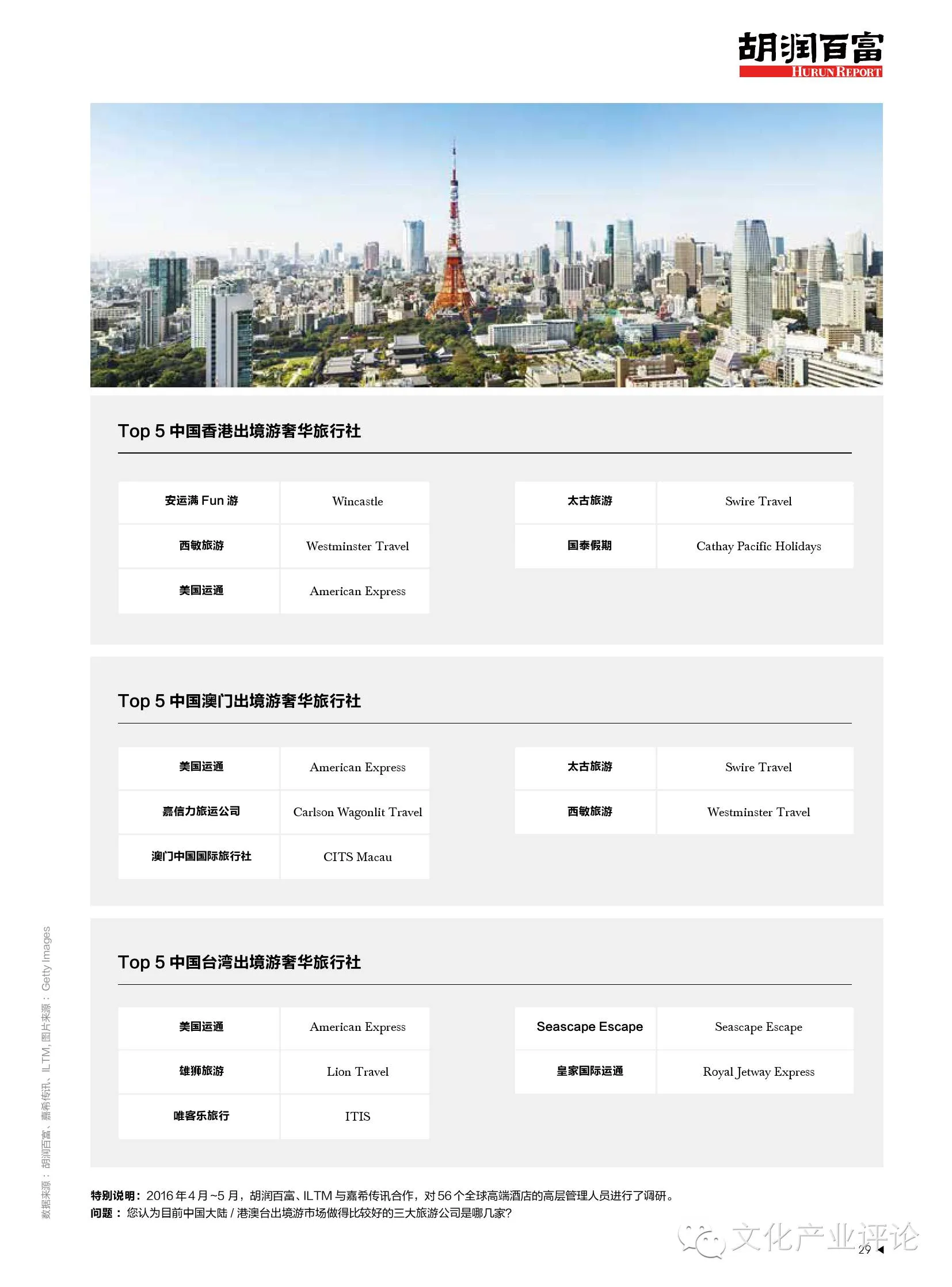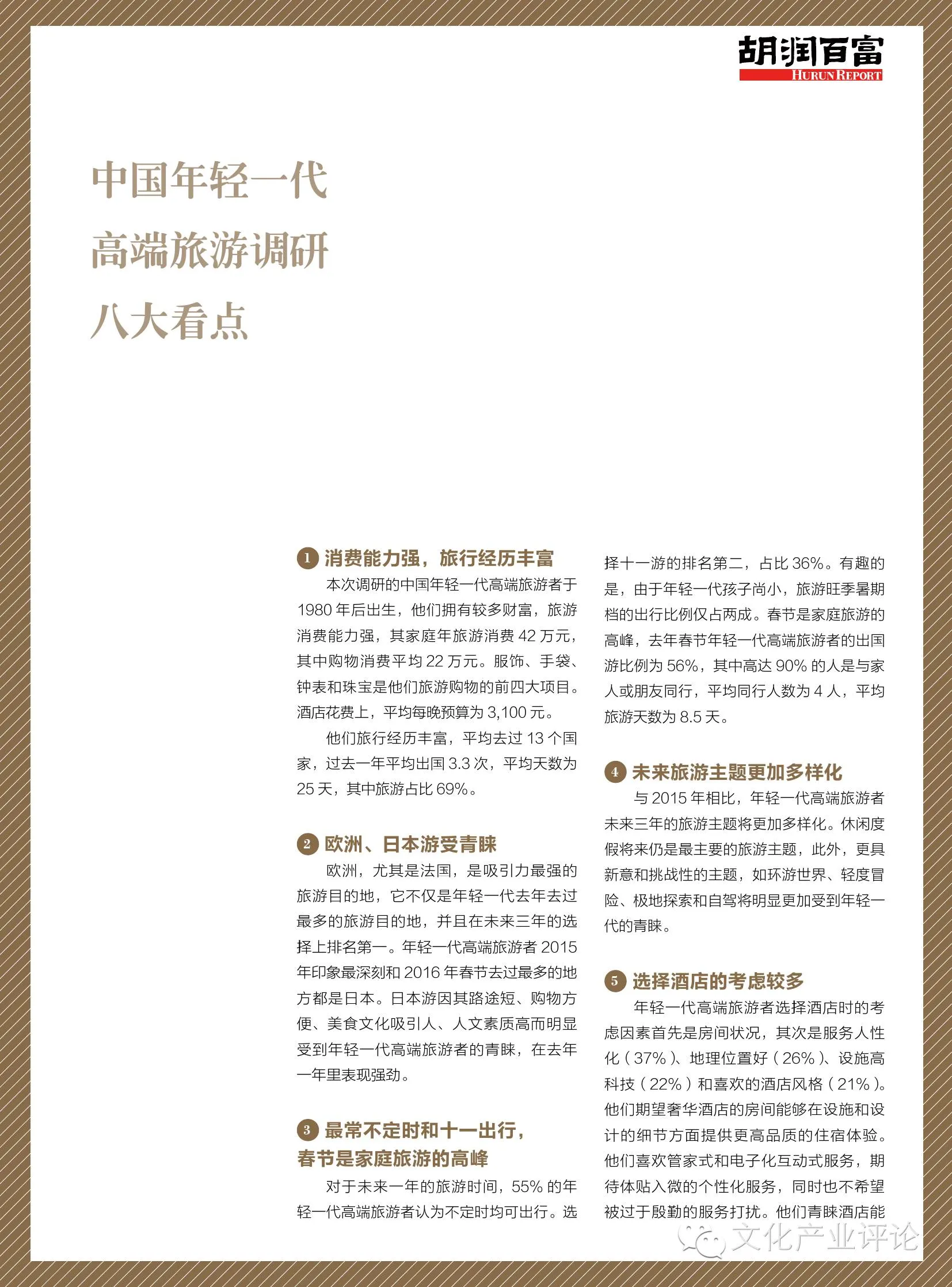 2016年5月30日,胡润研究院与国际酒店管理公司万豪国际集团携手发布《2016中国奢华旅游白皮书》(The Chinese Luxury Traveler 2016),这份专业报告深入研究了中国80后年轻一代高端旅游者的旅游方式、旅游消费情况和未来旅游趋势。