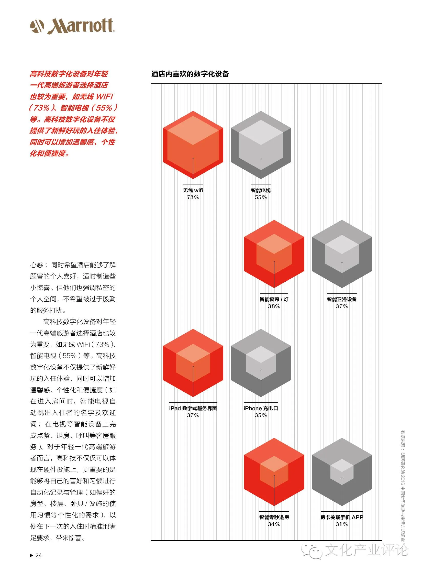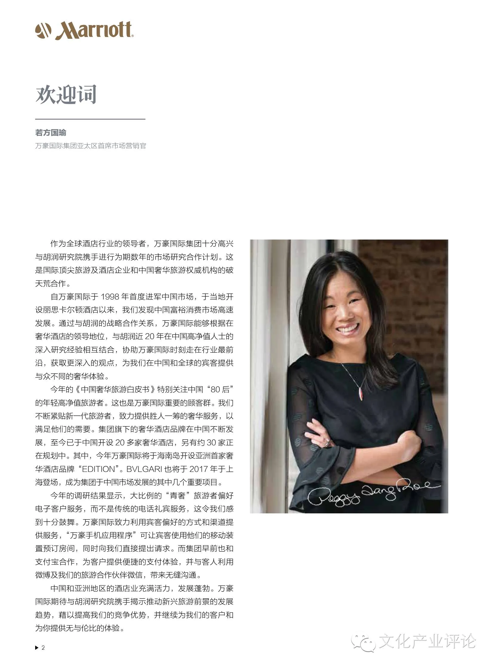 万豪国际集团亚太区首席市场营销官若方国瑜女士表示:“这是万豪的重点关注领域。” 2016年第一季度中国境内游游客数量增长7%,而出境游游客则上涨25%。她续说:“我们将高端定制服务的需求融合进了万豪常客奖励计划,远远超越酒店常规服务水准。精英会员特权现在包括贵宾定制体验,比如烹饪表演、演唱会、时装走秀、NBA全球比赛中国站等。我们还为普通话住客量身定制并推出全新的常客奖励计划—‘礼遇’,无论客人走到哪里,都能体验到宾至如归的感受。万豪国际很荣幸能和胡润百富合作这份奢华旅游白皮书,胡润百富已经成为全球最领先的研究中国高净值人群的权威机构。”