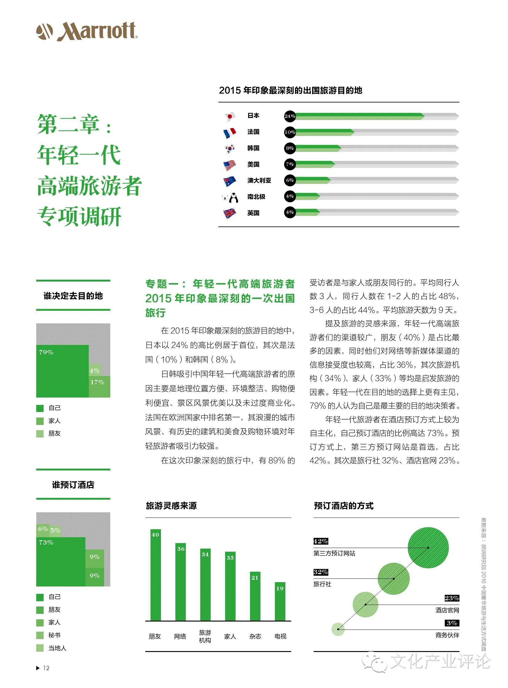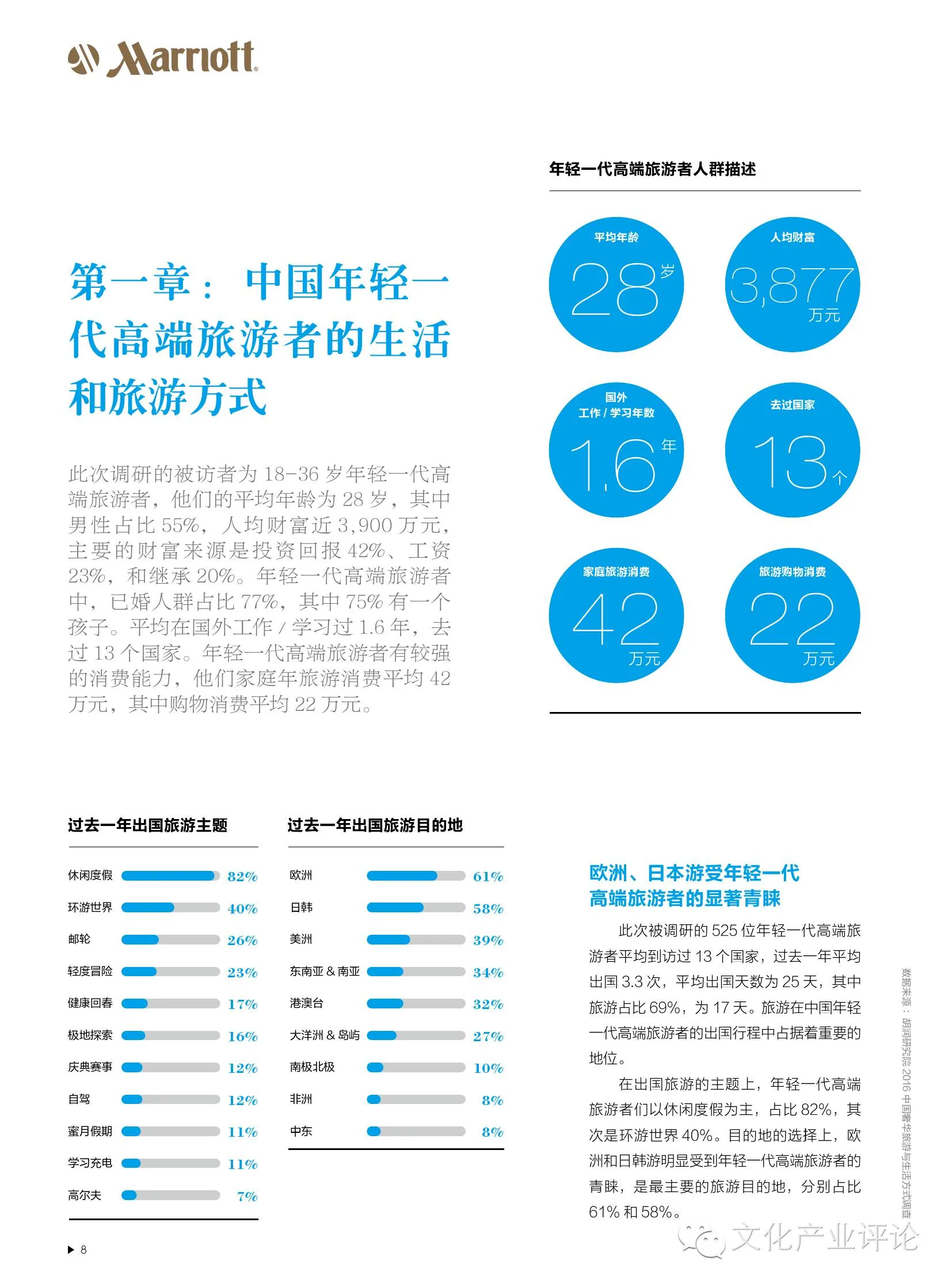 研究发现,年轻一代高端旅游者每三或四个月会选择出国,主要是为了休闲娱乐。相比他们的上一代,80后年轻一代高端旅游者更喜欢酒店的电子化互动式服务,青睐高科技数字化设备。热衷主题性旅游,喜欢3-4人的小团队出行。未来三年选择更远的旅游目的地如美洲、大洋洲&岛屿、非洲、中东和南北极的比例将大幅上升,选择更具新意和挑战性的旅游主题的比例也将明显上升。微信公众号、微信朋友圈分享已经成为他们最主要的旅游信息来源。