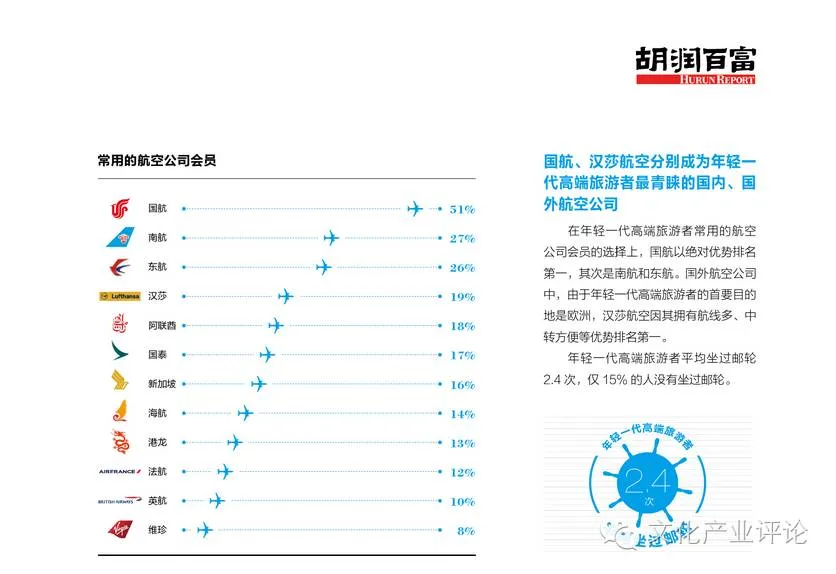 6.航空:在年轻一代高端旅游者常用的航空公司会员的选择上,国航以绝对优势排名第一(51%)。国外航空公司中,汉莎航空排名第一。