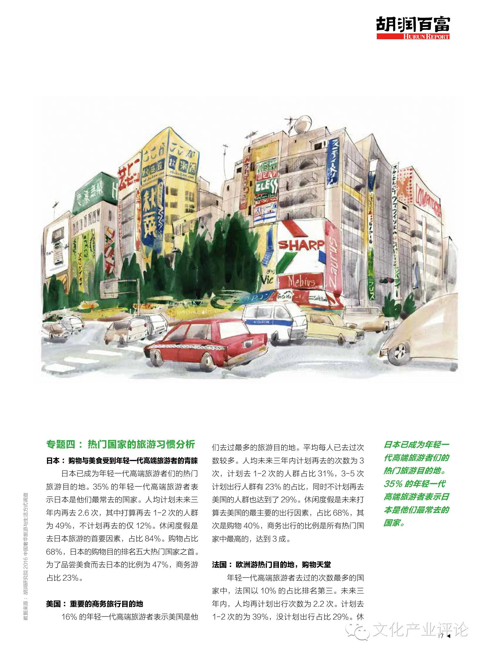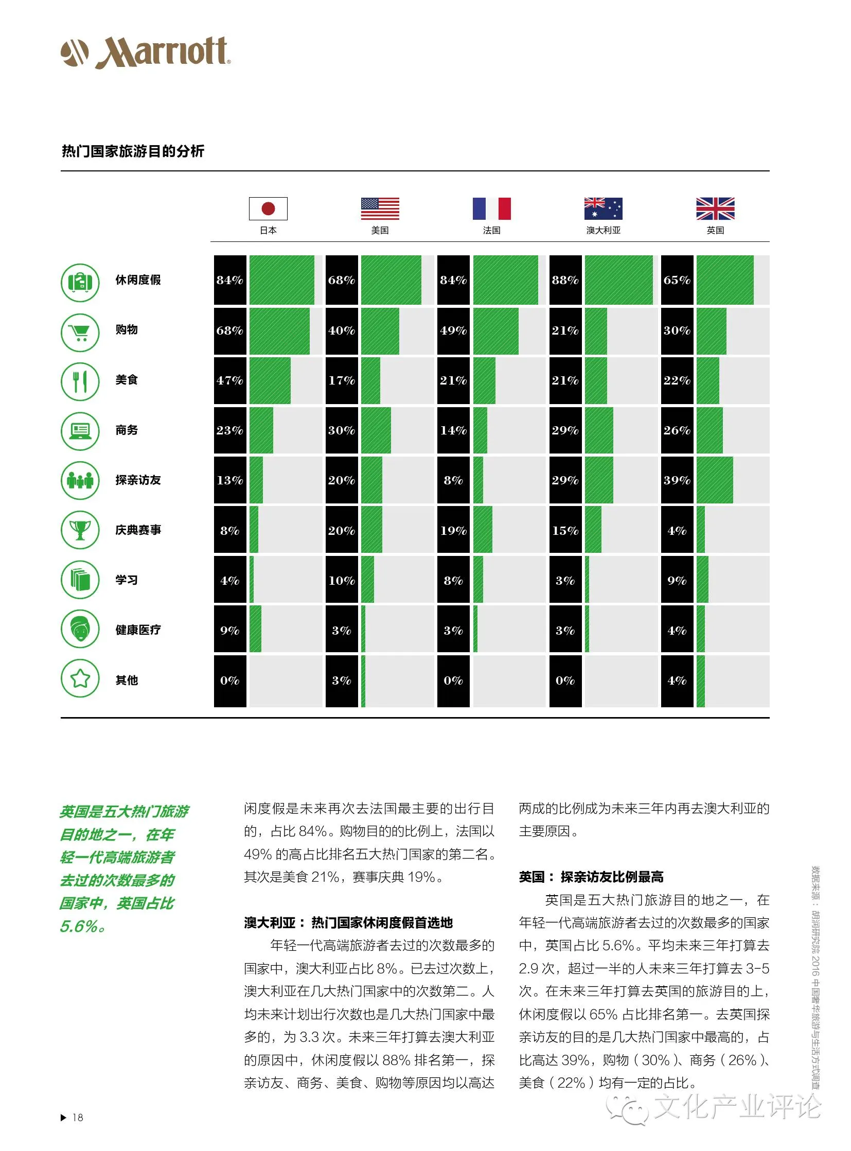 8.五大热门国家的旅游习惯:日本:购物与美食受到年轻一代高端旅游者的青睐;美国:重要的商务旅行目的地;法国:欧洲游热门目的地,购物天堂;澳大利亚:休闲度假首选地;英国:探亲访友比例最高。