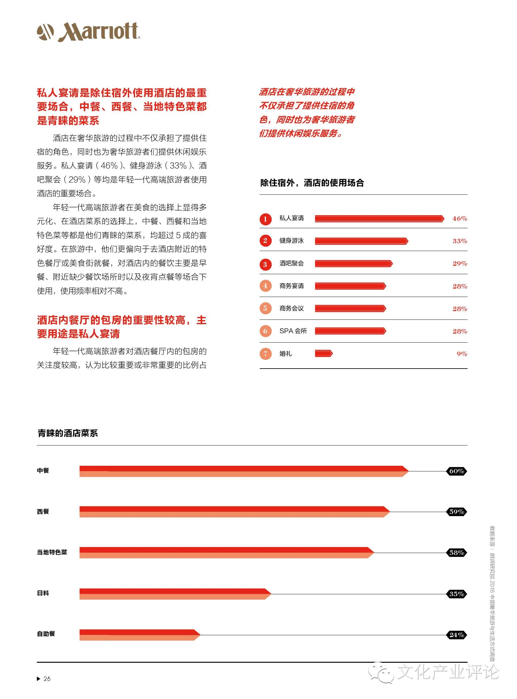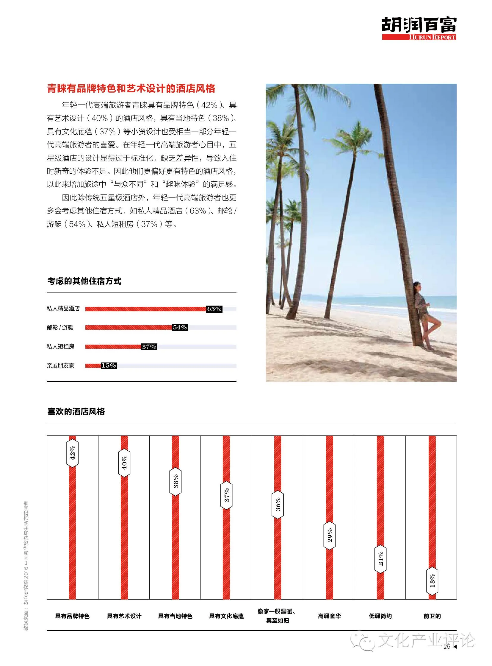 5.酒店:丽思卡尔顿是年轻一代高端旅游者最青睐的豪华酒店,且会员好评率最高。希尔顿是年轻一代高端旅游者最青睐的高端酒店,会员使用比例最高。房间干净是选择酒店时最主要考虑因素,其次是酒店服务人性化。喜欢管家式和电子化互动式服务,青睐高科技数字化设备。青睐有品牌特色和艺术设计的酒店风格。平均每晚预算3000元。