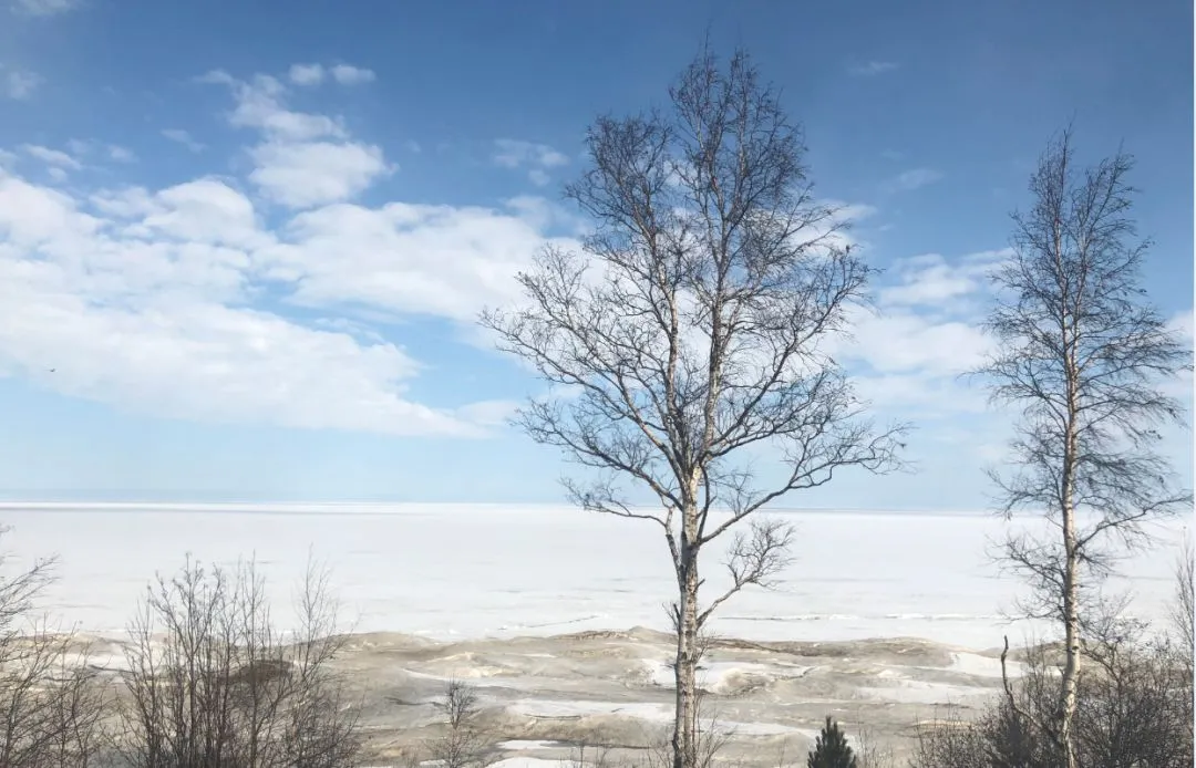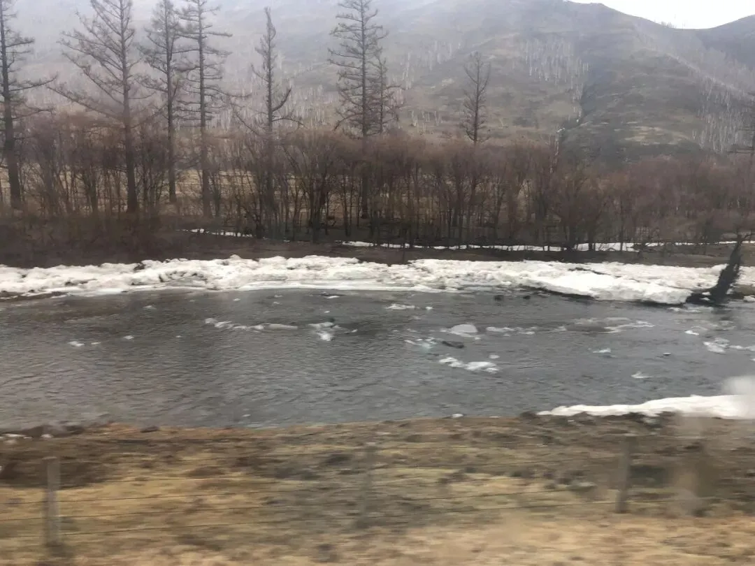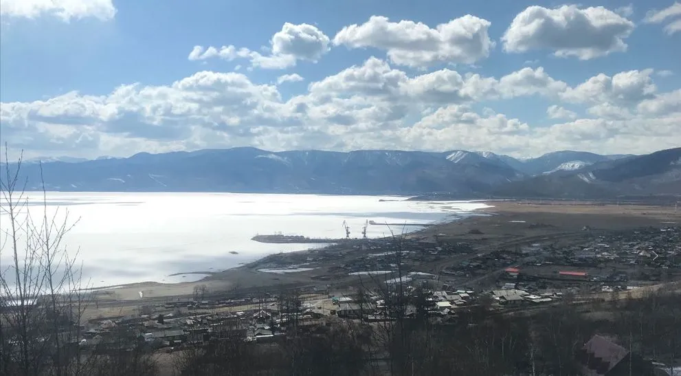 贝加尔湖是欧亚大陆最大的淡水湖,3.15万平方千米,相当于两个北京那么大。四月份天气已经转暖,但冰封的湖面,寂静无声。周边会有些许村落,周围的渔民会在洒满阳光的湖面上凿洞钓鱼,上午火车会围着贝加尔湖前行三个小时左右。
