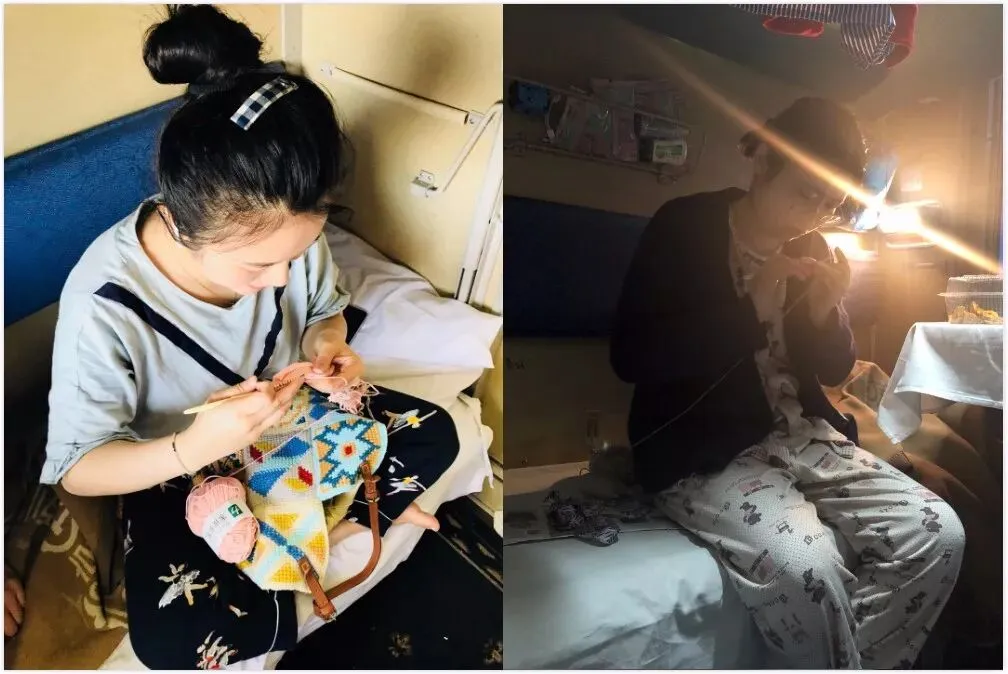 在去往餐车的路上,我们遇到了一对夫妇。先生端坐在沙发上看着书,太太半躺半坐在软卧上不紧不慢的玩着毛线起着针,引得我们挪不开步子。目光交集,他们朝着我们笑笑,态度非常友好,我们便在车厢口和她聊了会儿,并且征求同意拍了照。这不我们没带家伙,都不好切磋切磋,只好信誓旦旦的约定明天要带着针线来找她一起玩耍。
