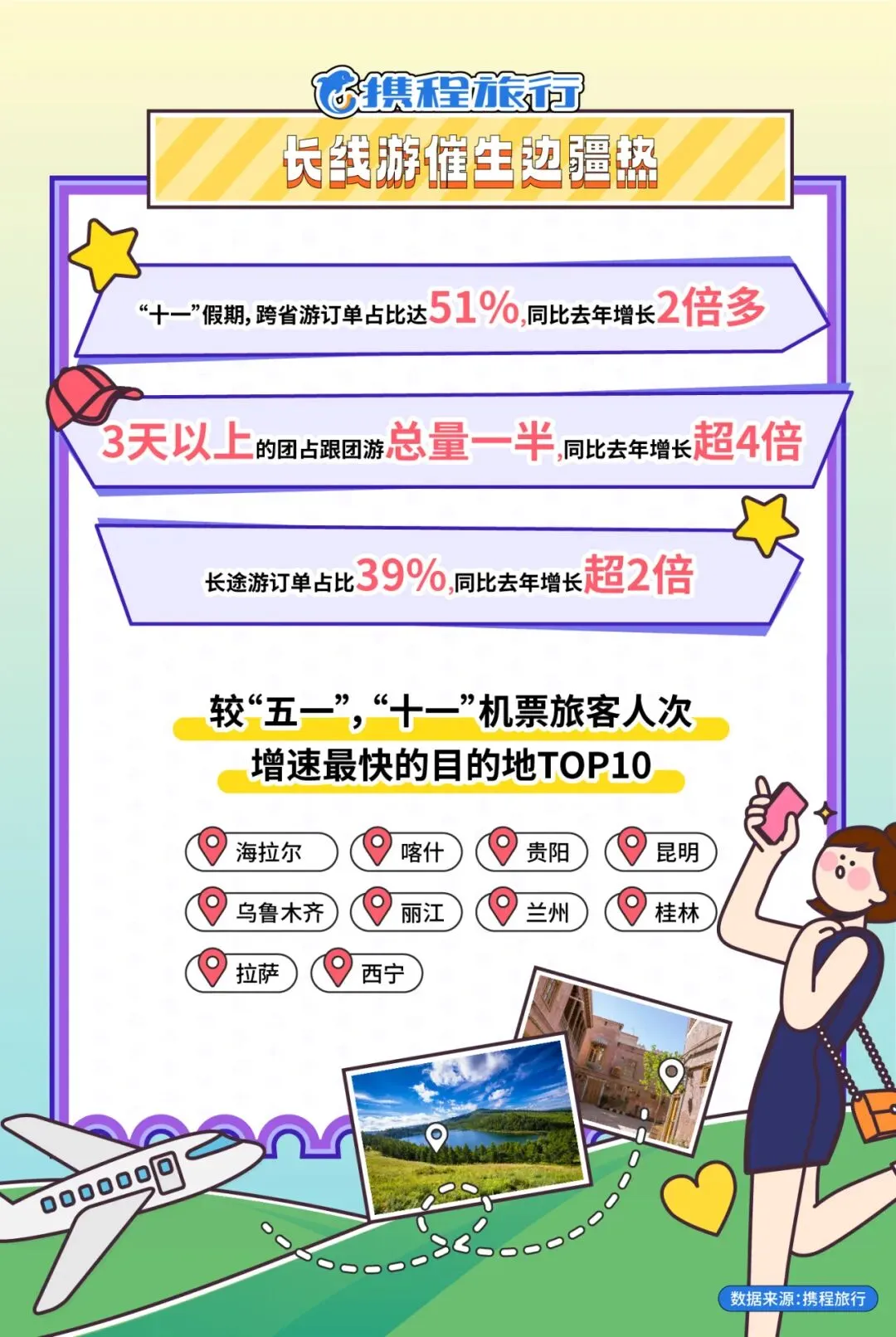 携程数据显示,“十一”假期,跨省游订单占比达51%,同比去年增长2倍多;3天以上的团占跟团游总量一半,同比去年增长超4倍;长途游订单占比39%,同比去年增长超2倍。