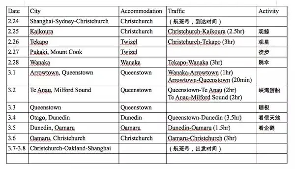 因为新西兰这样的地方是没什么景点看的,于是以城与镇为据点分割。住宿和城际交通与上一个行程同理,对住宿的特殊要求(带厨房、机场酒店)可另加标注。