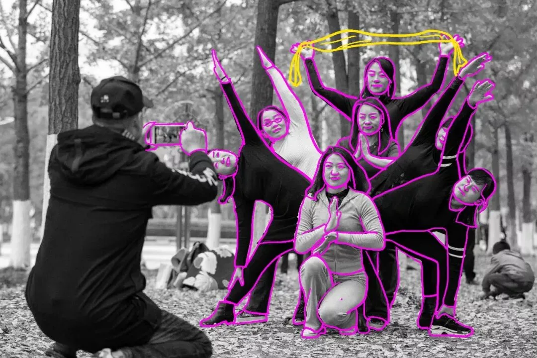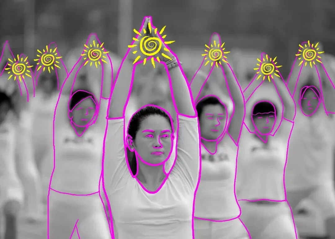 诗朗诵的站姿、墨镜下的知性笑容,高举双臂托举蓝天,她和成千上万位阿姨一样挥舞着彩色丝巾,信仰在天空中飘扬。