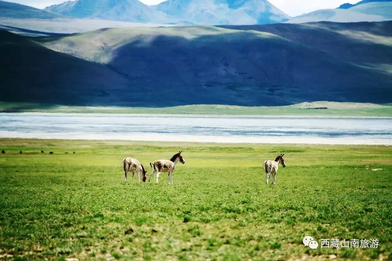 湖上黄鸭、灰鸭、沙鸭等水禽,追逐嬉戏。碧蓝清澈的湖水中倒影着四面山峰的倩影,湖光山色,相映成趣,湖边牛羊成群,驴马结队,难怪一首民歌里这样赞美羊卓雍措:“天上的仙镜,难比人间的草坪,湖畔的牛羊,好像那天上的繁星。”