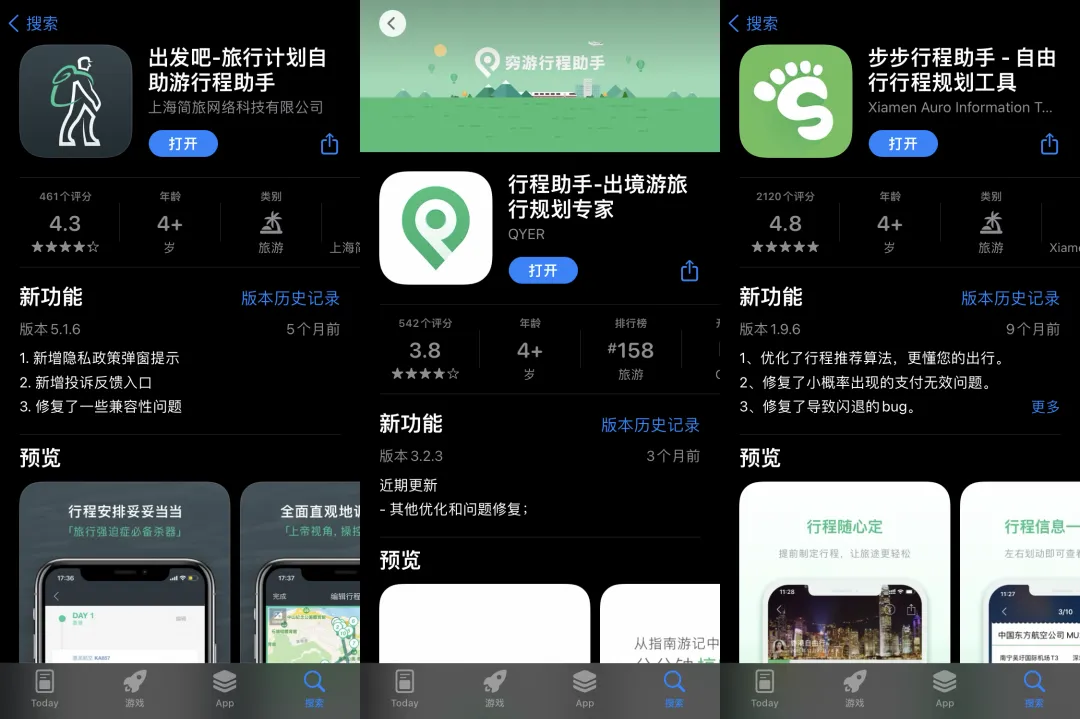 这三款应用都有iPhone和Android版,只不过行程助手在小米应用商店中的名称还是它的旧名“穷游行程助手”,而步步行程助手小黑只在应用宝中找到。