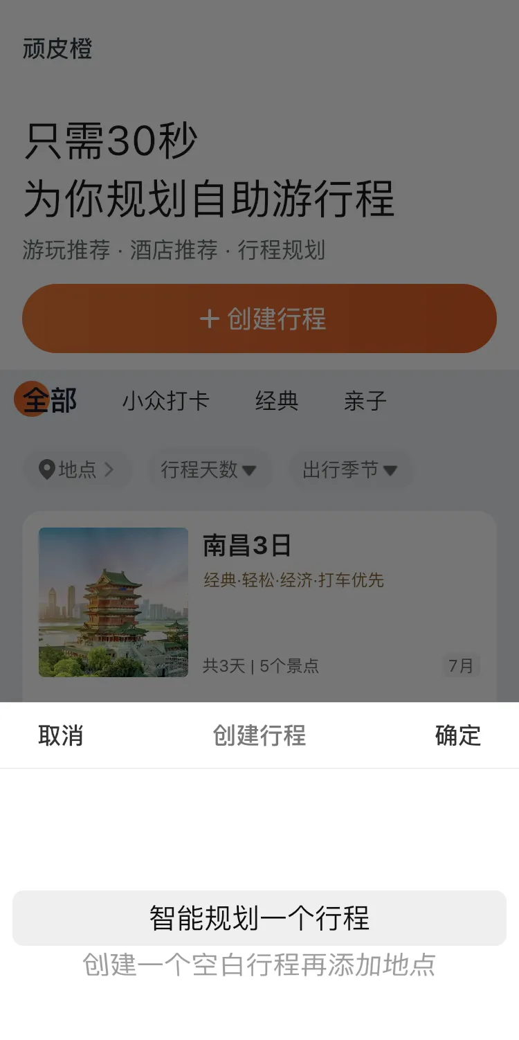 这四款应用的行程规划能力基本相近。以顽皮橙旅行为例,在点击“创建行程”之后,提供了智能规划行程和创建空白行程两种方案。