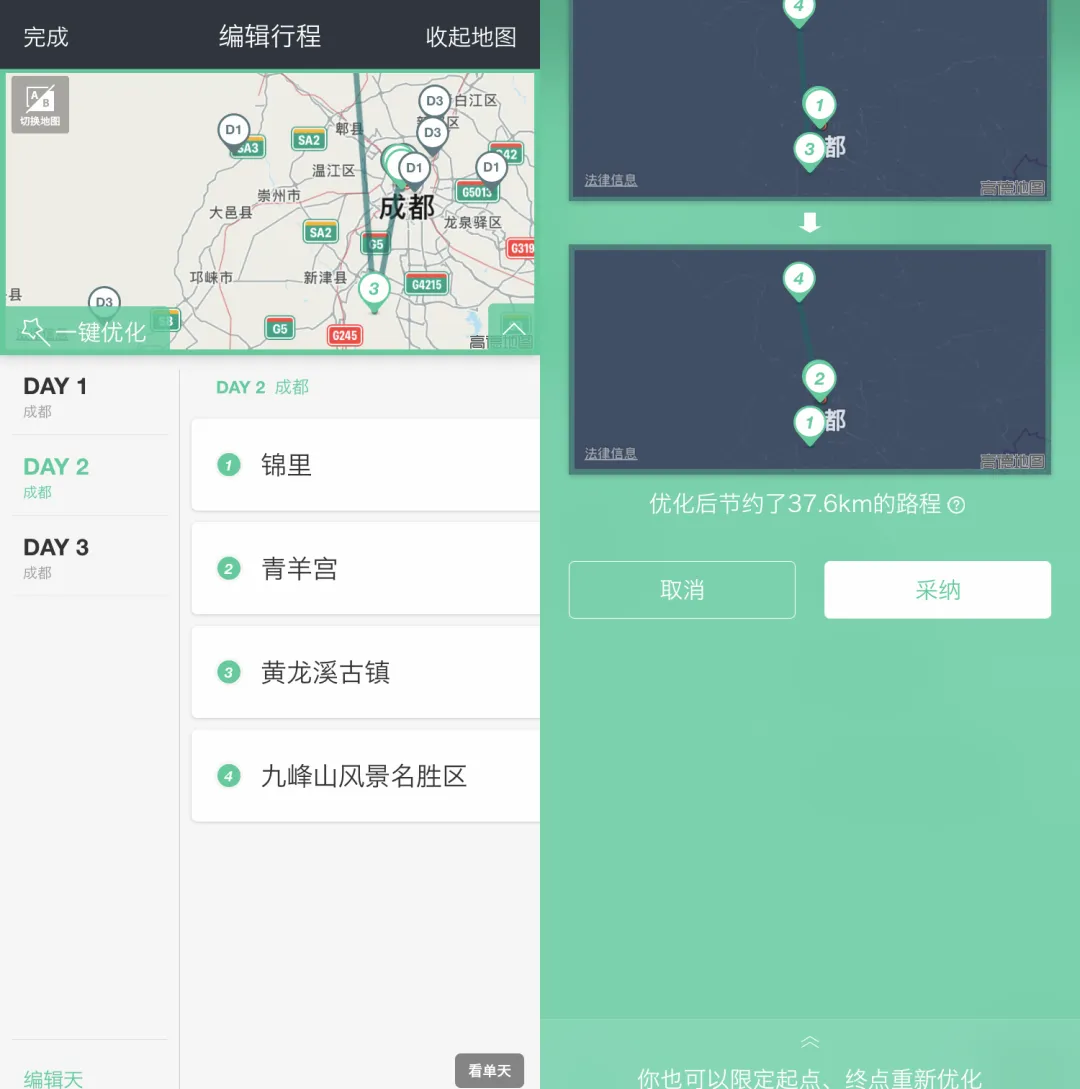 出发吧App在行程规划中还提供了一键优化功能,看起来非常贴心对吧……不过呢,小黑在体验之前,还以为它可以自动将距离较近的行程排列到一天当中,省去在路上来回奔波的时间。