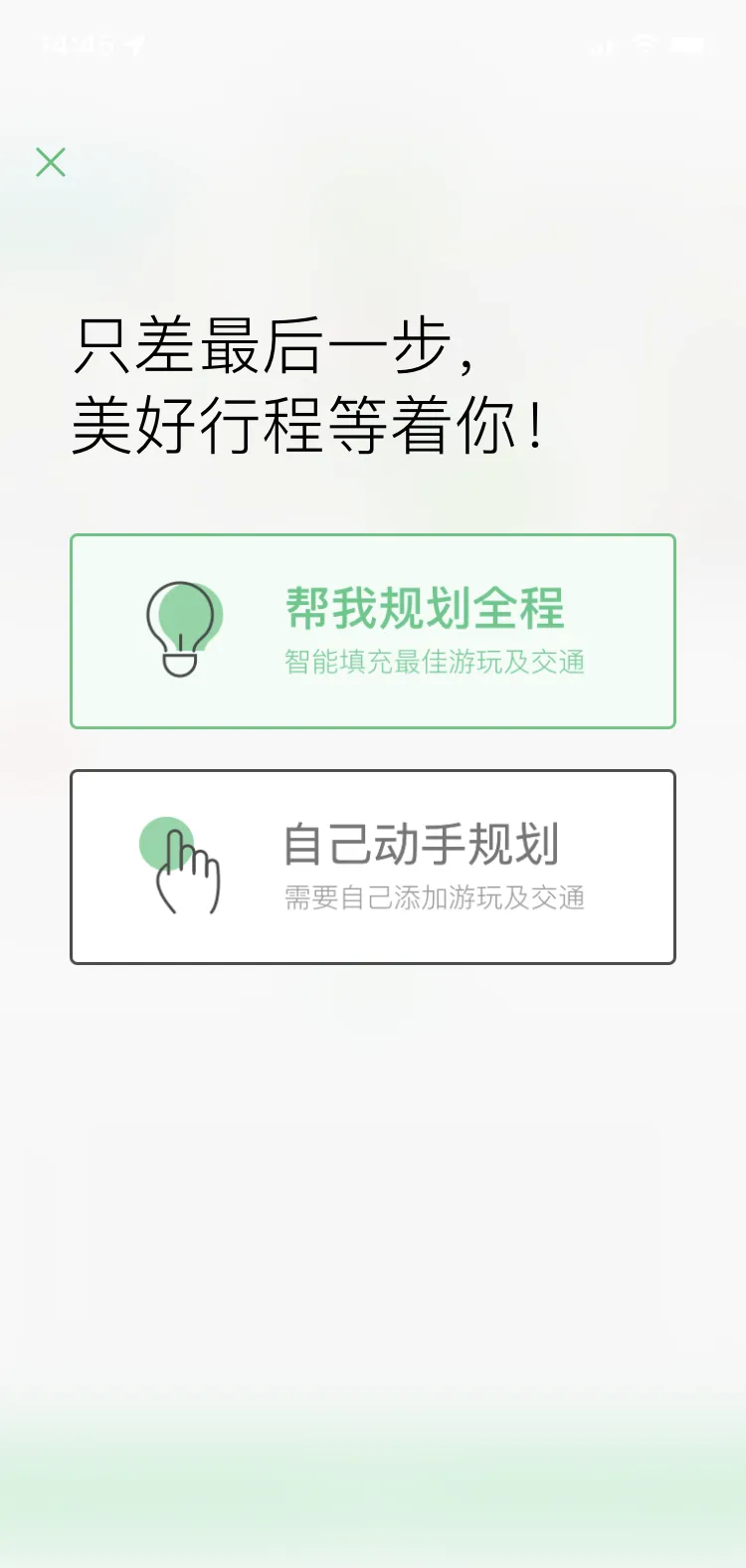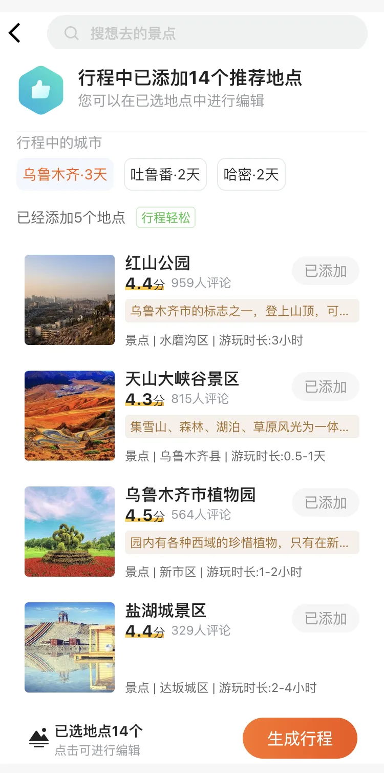 点击下一步之后,应用不会直接把你的行程安排好,而是进入了一个手动筛选页面,用户可以轻松调整行程,达到自己最满意的状态。