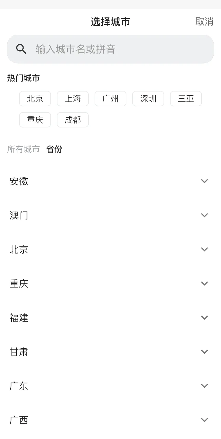 而在顽皮橙旅行中,应用提供了按照省份选择目的地城市的功能,这给想去西部旅行的小伙伴提供了不少便利。