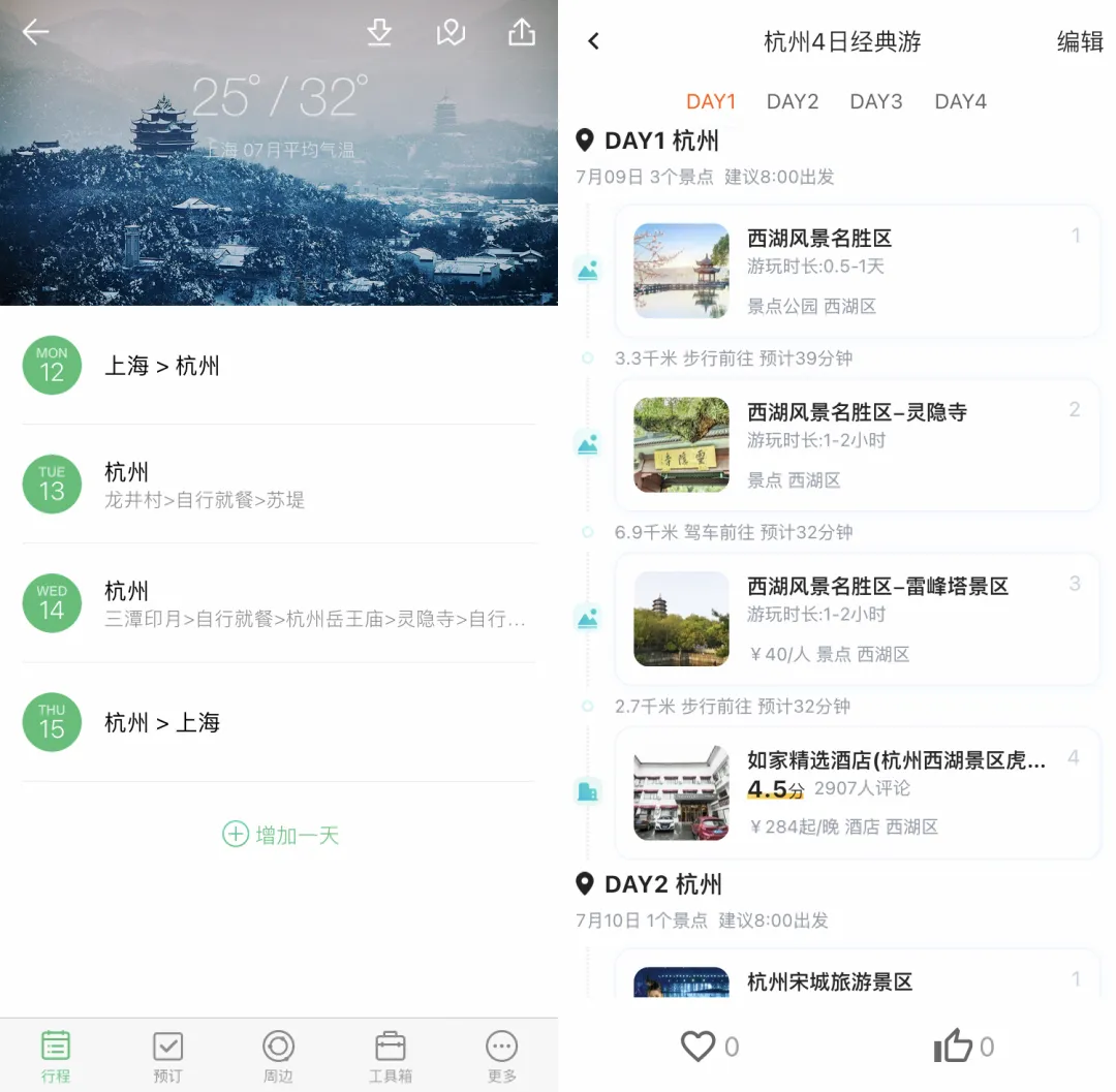 在旅游城市的短途游规划上,小黑更倾向于行程助手App规划的行程。至少在小黑看来,顽皮橙在第一天规划的行程直接过于紧张,要想在一天之内逛完西湖、灵隐寺和雷峰塔,就只能走马观花——哪怕开车也是如此。而第二天又只安排了宋城一个景点,不够“劳逸结合”。