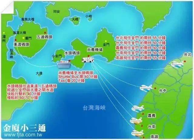 1992年3月,福建省提出“两门对开,两马先行”的“小三通”构想。这是由于“两门”(即大陆的厦门和台湾的金门)和“两马”(即大陆的福州马尾港和台湾的马祖)均只是相距咫尺的地方,在此进行小规模的“三通”可以说是在当时的限制中,带来有利于两岸民间发展的办法。