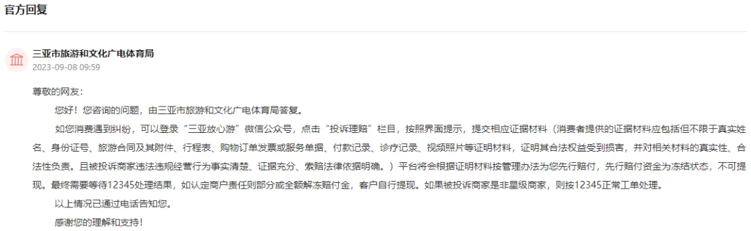 群众留言截图。 获悉群众留言后,三亚市旅游和文化广电体育局答复称,消费遇到纠纷,可以登录“三亚放心游”微信公众号,点击“投诉理赔”栏目,按照界面提示,提交相应证据材料。消费者提供的证据材料应包括但不限于真实姓名、身份证号、旅游合同及其附件、行程表、购物订单发票或服务单据、付款记录、诊疗记录、视频照片等证明材料,证明其合法权益受到损害,并对相关材料的真实性、合法性负责。被投诉商家违法违规经营行为事实清楚、证据充分、索赔法律依据明确。