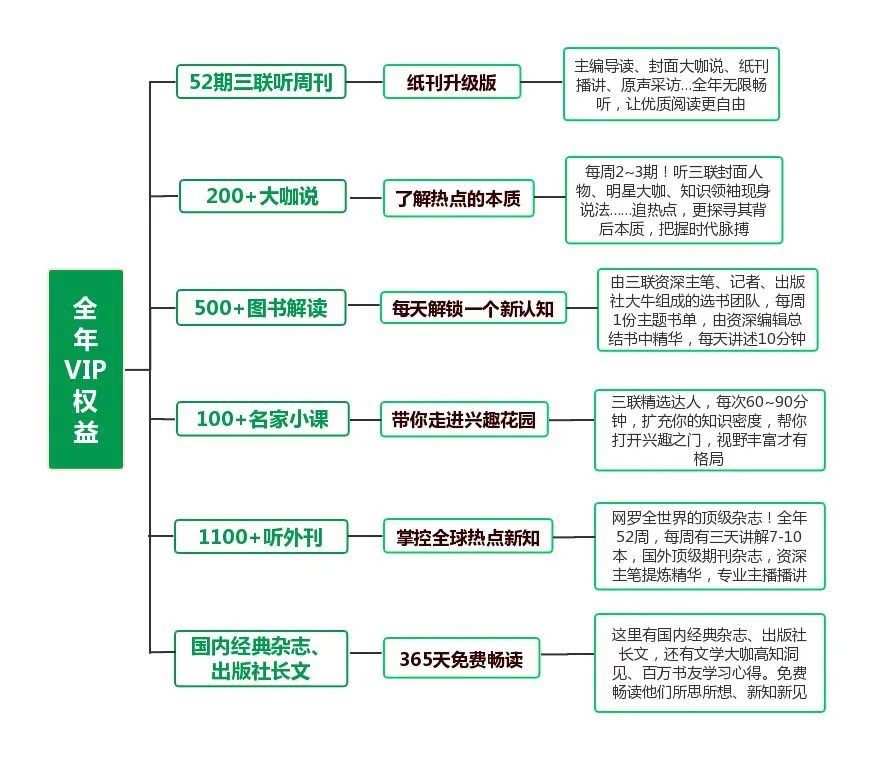如果你想免费收听全部专题,小编良心推荐中读VIP年卡。除听书外,购买VIP年卡,还可免费领取收听500+独家听书、200+大咖说、150+听外刊、365+听周刊等精彩内容。4月20日至4月29日0点购买或续费VIP的用户,还可享受四大限时特权。