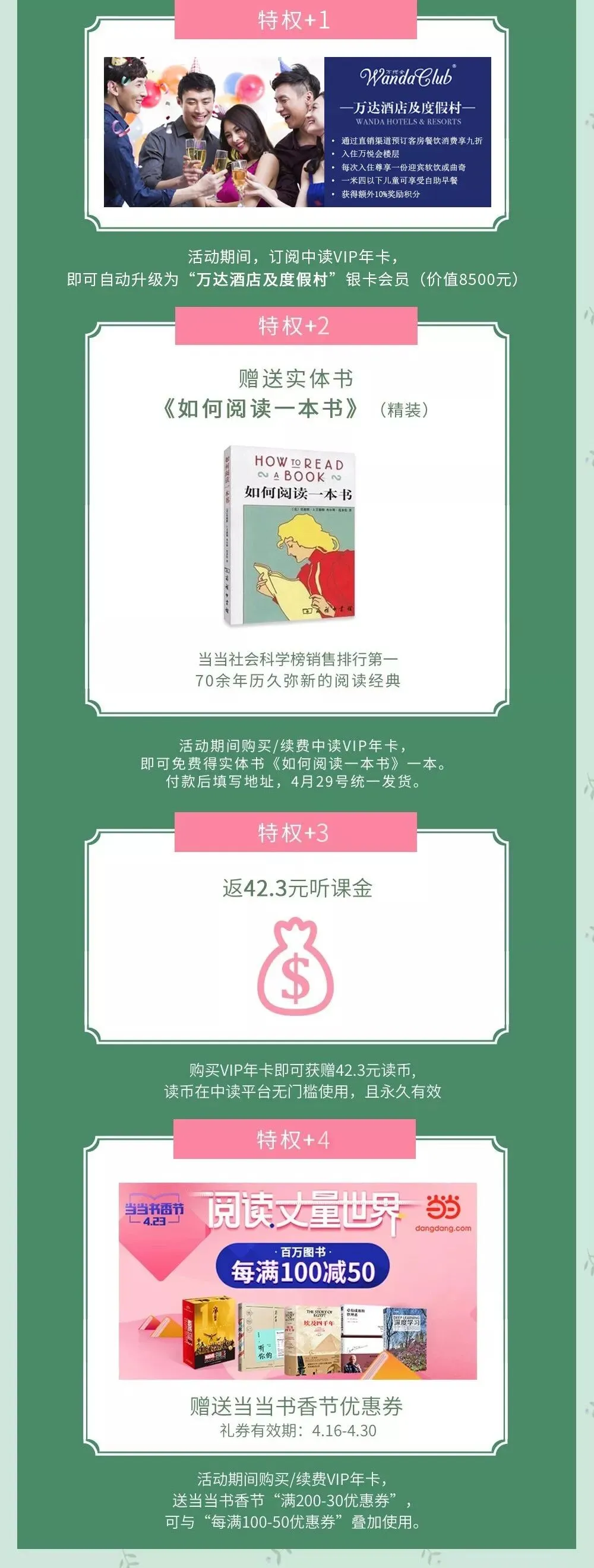 4月20日至4月28日期间,购买/续费中读VIP年卡即可享受限时特权。