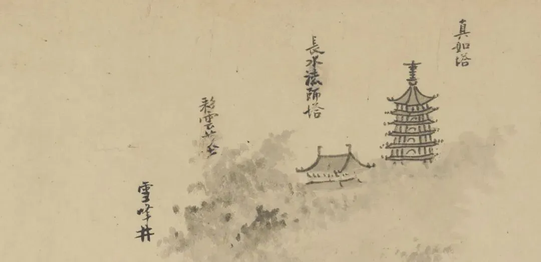 由真如塔向下观看,过雪峰井、跨一座长虹桥,可见金明寺。