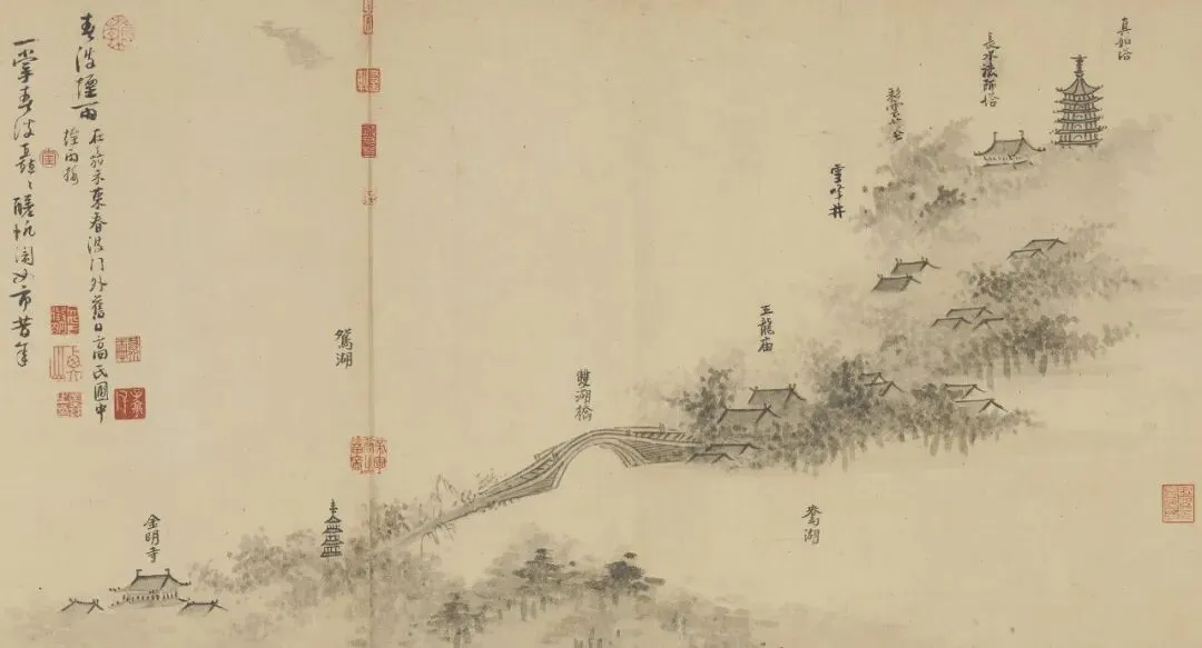 以上景致,吴镇一一看过。他似乎是从上空悠然而过,最终画下了带有俯视效果的《嘉禾八景图》。