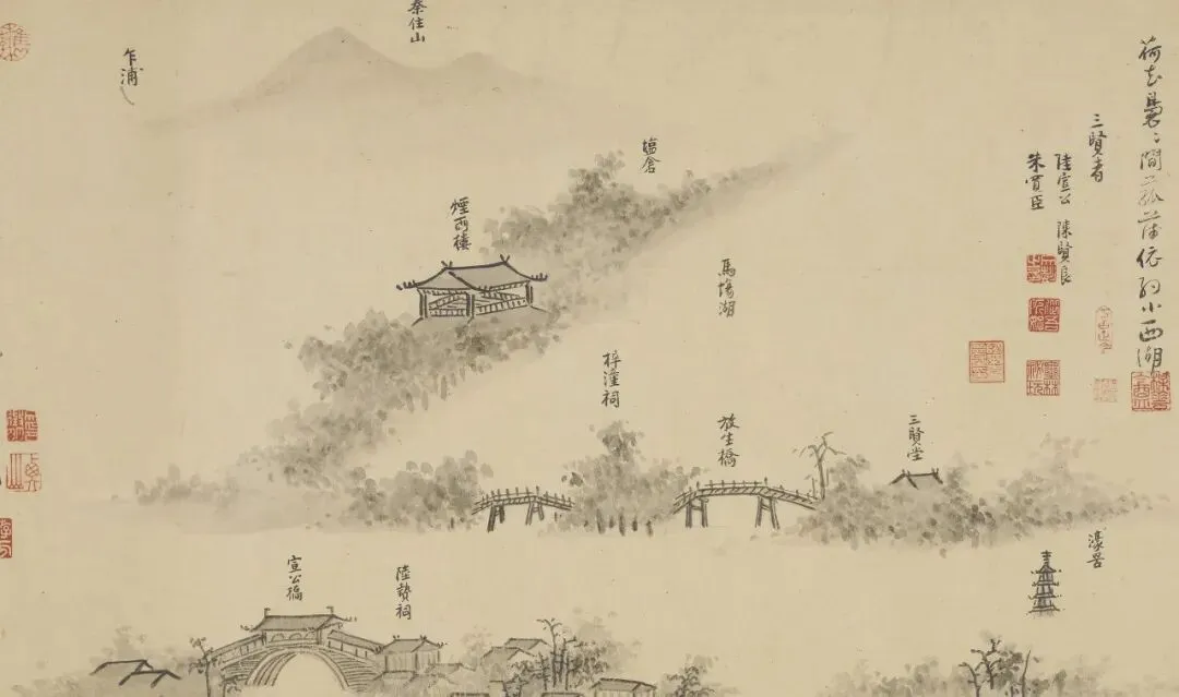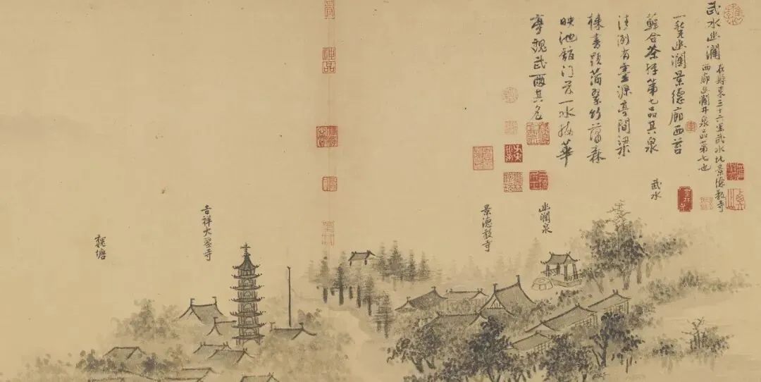 嘉兴,可简称为禾,嘉禾八景——空翠风烟、龙潭暮云、鸳湖春晓、春波烟雨、月波秋霁、三闸奔湍、胥山松涛和武水幽澜——便为嘉兴的八处景观。吴镇不仅将其全部画出,还在图上做了细致的文字介绍。倘若外人来到嘉兴,或可将此卷视作一份旅游指南。