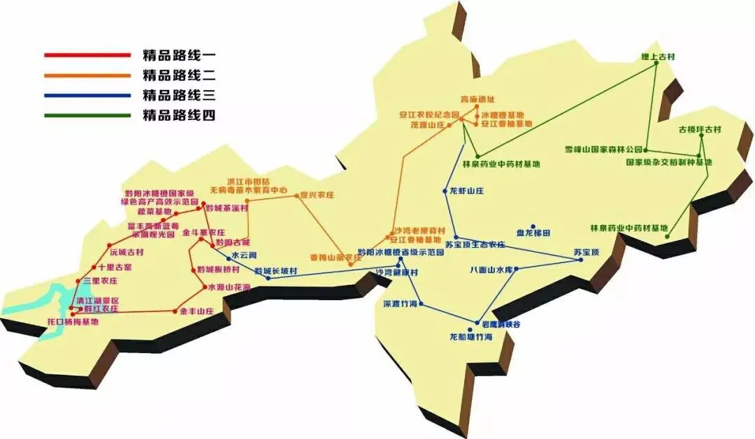 1、黔阳古城→茶溪美丽乡村示范村、黔阳冰糖橙标准示范园→星火村大棚蔬菜示范园→芦荻坪蓝莓观光采摘园→沅城古村→十里古窑→三里农庄→清江湖湿地公园→群红农庄→托口新镇→金丰山庄→水源山花海、板桥美丽乡村示范村→金斗寨休闲农庄→盘龙山庄→黔城镇。