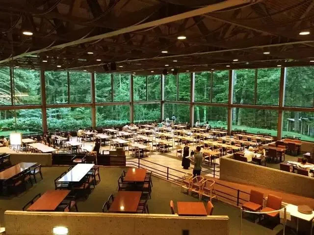 在品尝北海道四季蔬菜和海鲜烹制成的精美晚餐时,还可以透过巨大的玻璃幕墙看到童话般的原始森林↑
